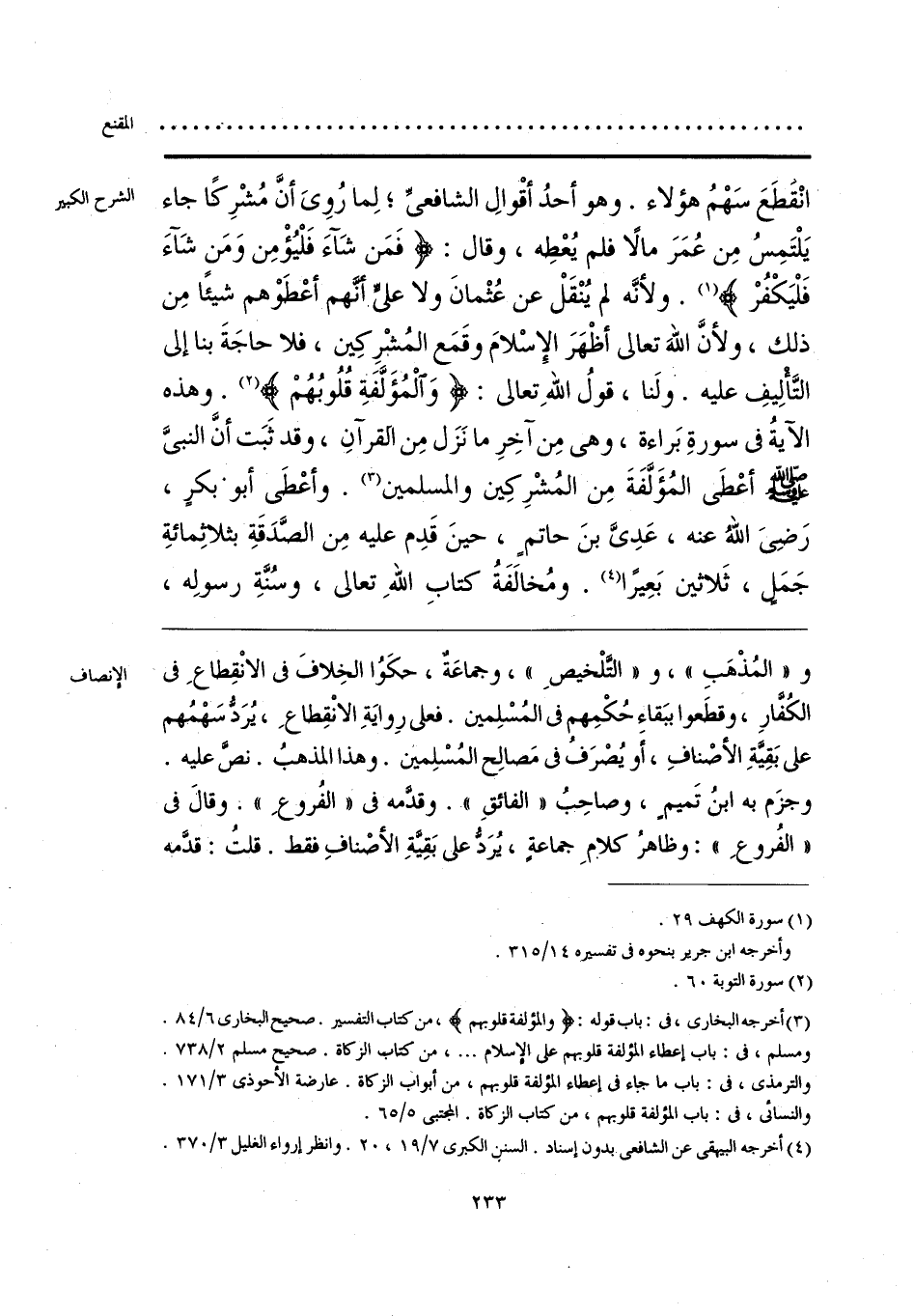 و «المُذْهَبِ»، و «التَّلْخيصِ»، وجماعَةٌ، حكَوُا الخِلافَ فى الانْقِطاعِ فى الكُفَّارِ، وقطَعوا ببَقاءِ حُكْمِهم فى المُسْلِمين. فعلى رِوايَةِ الانْقِطاعِ، يُرَدُّ، سَهْمُهم على بَقِيَّةِ الأصْنافِ، أو يُصْرَفُ فى مَصالِح المُسْلِمين. وهذا المذهبُ. نصَّ عليه. وجزَم به ابنُ تَميمٍ، وصاحِبُ «الفائقِ». وقدَّمه فى «الفُروعِ». وقالَ فى «الفُروعِ»: وظاهر كلامِ جماعةٍ، يُرَدُّ على بَقِيَّةِ الأصْنافِ فقط. قلتُ: قدَّمه
