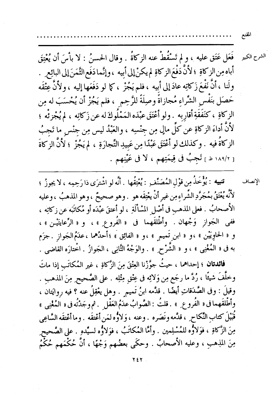 تنبيه: يُؤْخَذُ مِن قوْلِ المُصَنِّفِ: يُعْتِقُها. أنَّه لو اشْترَى ذا رَحِمِه، لا يجوزُ؛ لأنَّه يُعْتَقُ بمُجَرَّدِ الشِّراءِ مِن غيرِ أنْ يعْتِقَه هو. وهو صحيحٌ، وهو المذهبُ، وعليه الأصحابُ. فعلى المذهبِ فى أصْلِ المسْألَةِ، لو أعتقَ عبْدَه أو مُكاتَبَه عن زكاتِه، ففى الجَوازِ وَجْهان. وأطْلقَهما فى «الفُروعِ»، و «الرِّعايتَيْن»، و «الحاوِيَيْن»، و «ابنِ تَميمٍ»، و «الفائِق»؛ أحدُهما، عدَمُ الجَوازِ. جزَم به فى «المُغْنِى»، و «الشَّرْحِ». والوَجْهُ الثَّانِى، الجَوازُ. اخْتارَه القاضى.