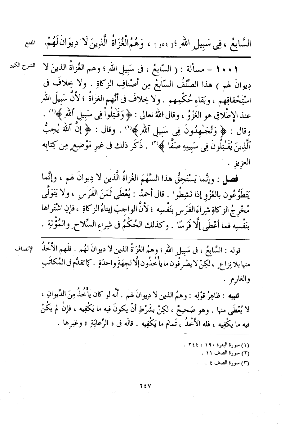 قوله: السَّابِعُ، فى سَبِيلِ اللَّهِ؛ وَهُمُ الْغُزَاةُ الَّذِينَ لَا دِيوَانَ لَهُمْ. فلَهم الأخْذُ منها بلا نِزاعٍ، لكِنْ لا يصْرِفُون ما يأْخُذُون إلَّا لجِهَةٍ واحدَةٍ. كما تقدَّم فى المُكاتَبِ والغارِمَ.