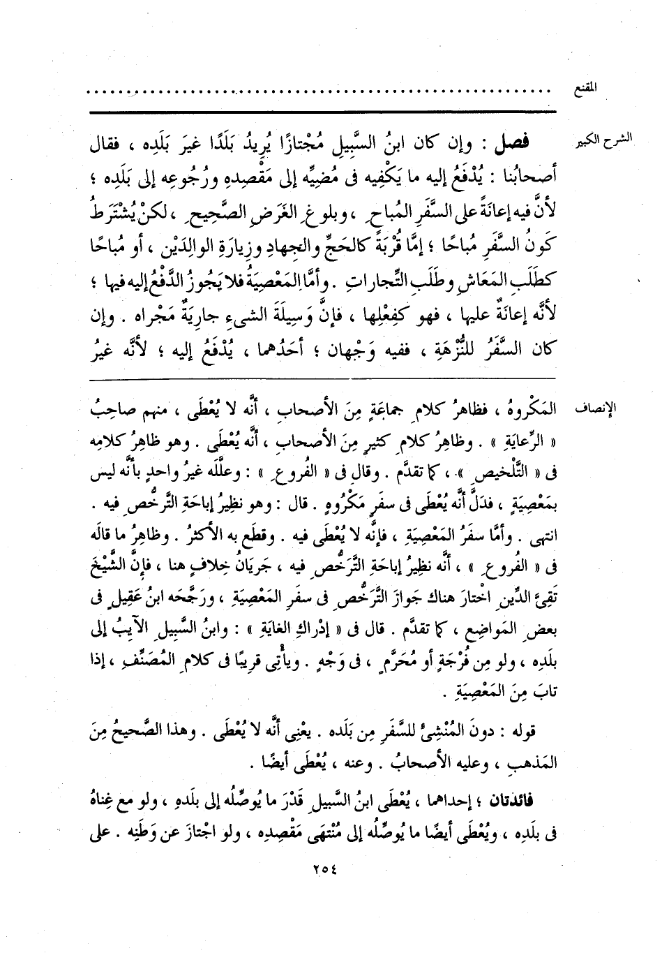 المَكْروهُ، فظاهرُ كلامِ جماعَةٍ مِنَ الأصحابِ، أنَّه لا يُعْطَى، منهم صاحِبُ «الرِّعايَةِ». وظاهِرُ كلامِ كثير مِنَ الأصحابِ، أنَّه يُعْطَى. وهو ظاهِرُ كلامِه فى «التَّلْخيصِ». كما تقدَّم. وقالِ فى «الفُروعِ»: وعلَّلَه غيرُ واحدٍ بأنَّه ليس بمَعْصِيَةٍ، فدَلَّ أنَّه يُعْطَى فى سفَر مَكْرُوهٍ. قال: وهو نظِيرُ إباحَةِ التَّرخُّصِ فيه. انتهى. وأمَّا سفَرُ المَعْصِيَةِ، فإنَّه لا يُعْطَى فيه. وقطَع به الأكثرُ. وظاهِرُ ما قالَه فى «الفُروعِ»، أنَّه نظِيرُ إباحَةِ التَّرَخُّصِ فيه، جَريَانُ خِلافٍ هنا، فإنَّ الشَّيْخَ تَقِىُّ الدِّينِ اختارَ هناك جَوازَ التَّرَخُّصِ فى سفَرِ المَعْصِيَةِ، ورَجَّحَه ابنُ عَقِيلٍ فى بعضِ المَواضِعِ كما تقدَّم. قال فى «إدْراكِ الغايَةِ»: وابنُ السَّبِيلِ الآيِبُ إلى بلَدِه، ولو مِن فُرْجَةٍ أو مُحَرَّم، فى وَجْهٍ. ويأْتِى قرِيبًا فى كلامِ المُصَنِّفِ، إذا تابَ مِنَ المَعْصِيَةِ.