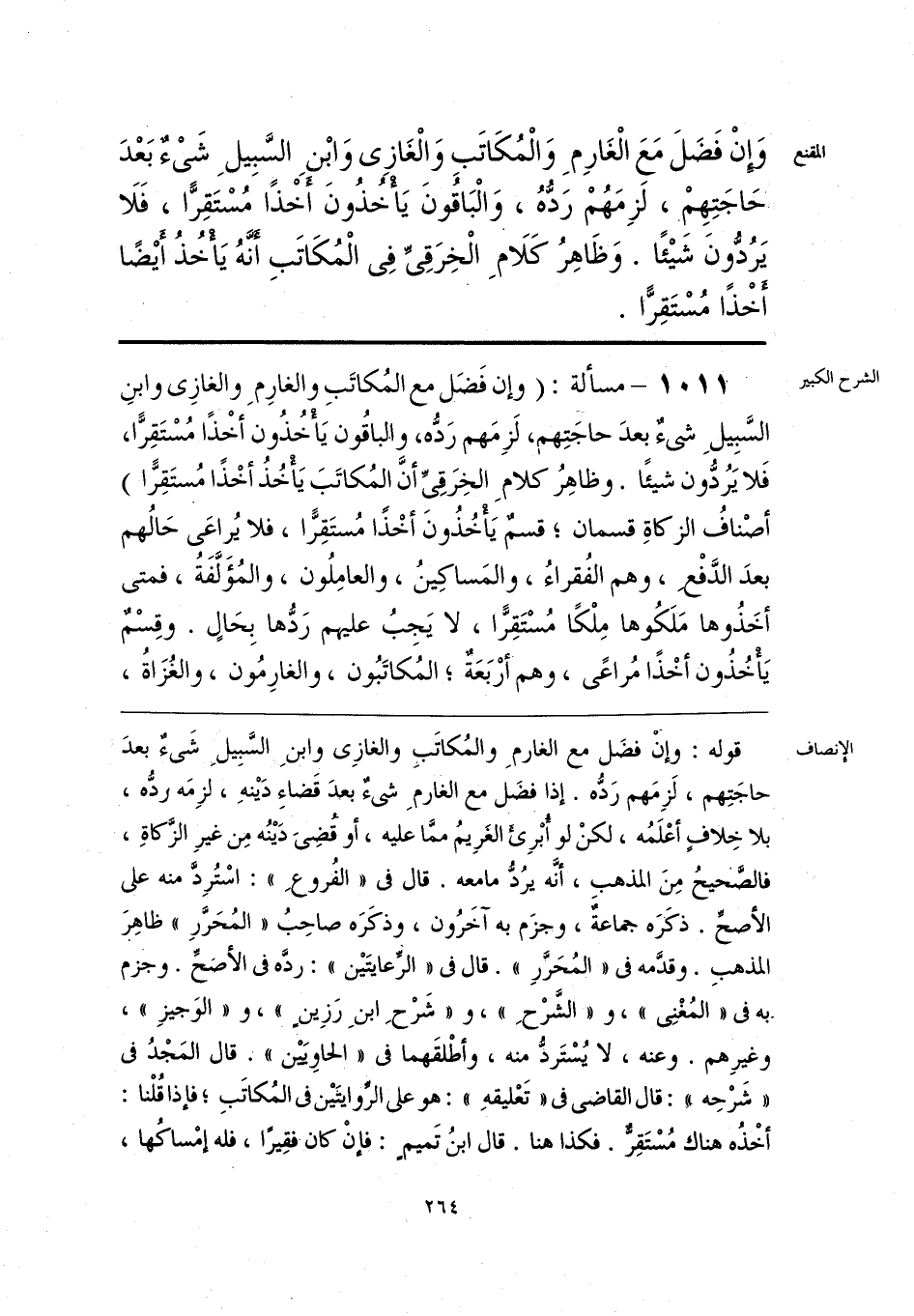 وَإِنْ فَضَلَ مَعَ الْغَارِمِ وَالْمُكَاتَبِ وَالْغَازِى وَابْنِ السَّبِيلِ شَىْءٌ بَعْدَ حَاجَتِهِمْ، لَزِمَهُمْ رَدُّهُ، وَالْبَاقُونَ يَأْخُذُونَ أَخْذًا مُسْتَقِرًّا، فَلَا يَرُدُّونَ شَيْئًا. وَظَاهِرُ كَلَامِ الْخِرَقِىِّ فى الْمُكَاتَبِ أَنَّهُ يَأْخُذُ أيْضًا أخْذًا مُسْتَقِرًّا.