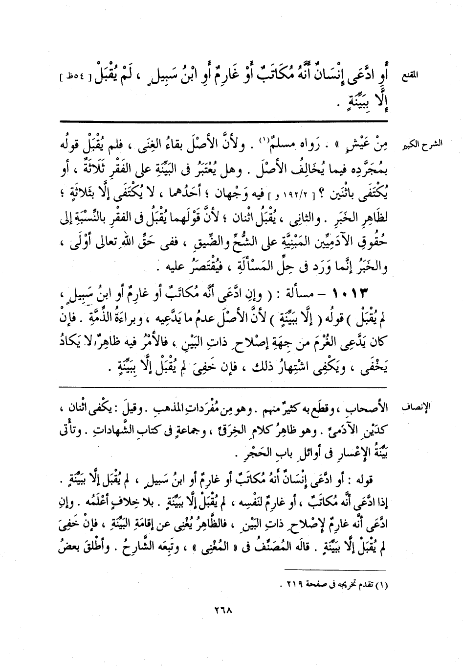 قوله: أو ادَّعى إنْسَانٌ أنَّهُ مُكاتَبٌ أو غارِمٌ أو ابنُ سَبيلٍ، لم يُقْبَل إِلَّا ببَيِّنَةٍ. إذا ادَّعَى أنَّه مُكاتَبٌ، أو غارِمٌ لنَفْسِه، لم يُقْبَلْ إِلَّا ببَيِّنةٍ. بلا خِلافٍ أعْلَمُه. وإنِ ادَّعَى أنَّه غارِمٌ لإِصْلاحِ ذاتِ البَيْنِ، فالظَّاهِرُ يُغْنِى عن إقامَةِ البَيِّنةِ، فإنْ خَفِىَ لم يُقْبَلْ إِلَّا ببَيِّنةٍ. قالَه المُصَنِّفُ فى «المُغْنِى»، وتَبِعَه الشَّارِحُ. وأطْلقَ بعضُ