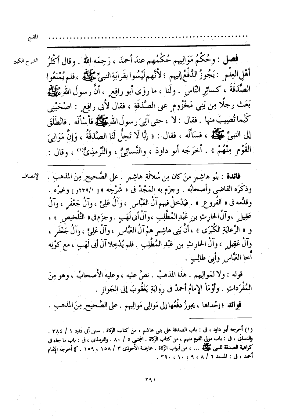 فائدة: بنُو هاشِمٍ منَ كان مِن سُلالَةِ هاشِم. على الصَّحيحِ مِنَ المذهبِ. وذكَرَه القاضى وأصحابُه. وجزَم به المَجْدُ فى «شَرْحِه» وغيرُه. وقدَّمه فى «الفُروعِ». فيَدْخلُ فيهم آلُ العَبَّاسِ، وآلُ عَلِىٍّ، وآلُ جَعْفَر، وآلُ عَقِيلٍ، وآلُ الحارِثِ بنِ عَبْدِ المُطلِبِ، وآلُ أبى لَهَب. وجزَم فى «التَّلْخيصِ»، و «الرِّعايَةِ الكُبْرَى»، أن بَنِى هاشِمٍ همْ آلُ العَبَّاسِ، وآلُ عَلِىٍّ، وآلُ جَعْفَرٍ، وآلُ عَقيلٍ، وآلُ الحارِثِ بنِ عَبْدِ المُطَّلِبِ. فلم يُدْخِلا آلَ أبى لَهَبٍ، مع كوْنِه أخا العَبَّاسِ وأبِى طالِبٍ.
