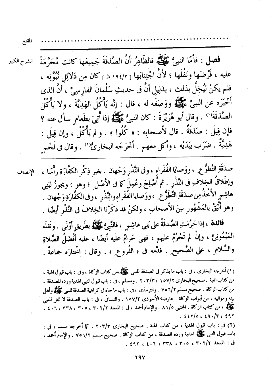 فائدة، إذا حَرُمَتِ الصَّدقَةُ على بنى هاشِمٍ، فالنَّبِىُّ -صلى اللَّه عليه وسلم- بطَريقٍ أوْلَى. ونَقلَه المَيْمُونِىُّ، وإنْ لم تَحْرُمْ عليهم، فهى حَرامٌ عليه أيضًا، عليه أفْضَلُ الصَّلاةِ والسَّلامِ، على الصَّحيحِ. قدَّمه فى «الفُروعِ». وقال: اخْتارَه جماعةٌ.