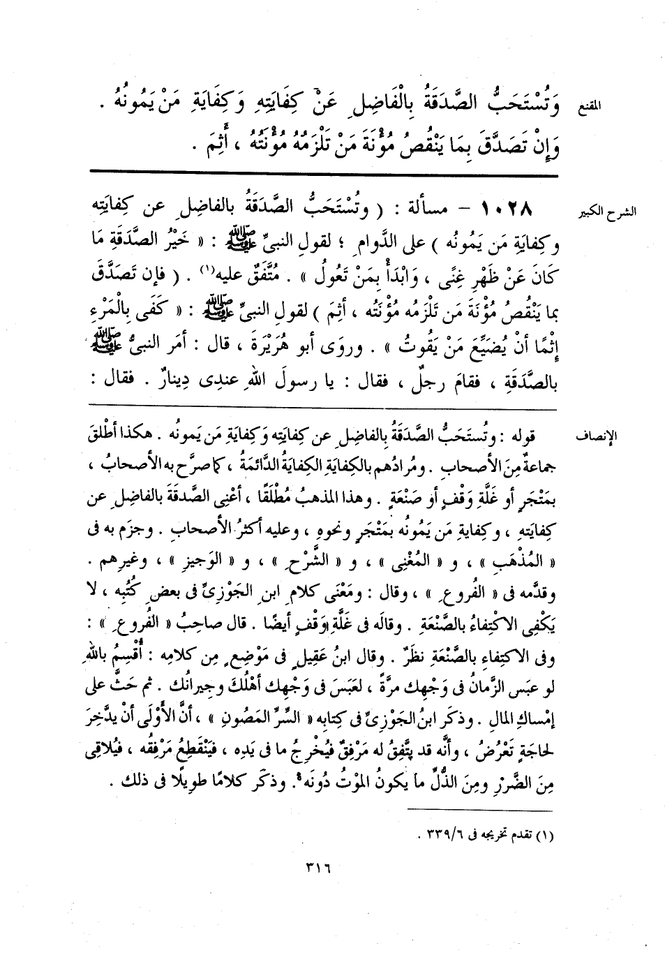قوله: وتُستَحَبُّ الصَّدَقَةُ بِالفاضِلِ عن كِفايَتِه وَكِفايَةِ مَن يَمونُه. هكذا أطْلقَ جماعة مِنَ الأصحابِ. ومُرادُهم بالكِفايَةِ الكِفايَةُ الدَّائمَةُ، كما صرَّح به الأصحابُ، بمَتْجَرٍ أو غَلَّةِ وَقْفٍ أؤ صَنْعَةٍ. وهذا المذهبُ مُطْلَقًا، أعْنِى الصَّدقَةَ بالفاضِلِ عن كِفايَتهِ، وكِفايةِ مَن يَمُونُه بمَتْجَرٍ ونحوهِ، وعليه أكثرُ الأصحابِ. وجزَم به فى «المُذْهَبِ»، و «المُغْنِى»، و «الشرْحِ»، و «الوَجيزِ»، وغيرِهم. وقدَّمه فى «الفُروعِ»، وقال: ومَعْنَى كلام ابنِ الجَوْزِىِّ فى بعضِ كُتُبِه، لا يَكْفِى الاكْتِفاءُ بالصَّنْعَةِ. وقالَه فى غَلَّةِ وَقْفٍ أَيضًا. قال صاحِبُ «الفُروعِ»: وفى الاكتِفاءِ بالصَّنْعَةِ نظَرٌ. وقال ابنُ عَقِيلٍ فى مَوْضِع مِن كلامِه: أُقْسِمُ باللَّهِ لو عبَس الزَّمانُ فى وَجْهِك مرَّةً، لعَبَسَ فى وَجْهِك أهْلُكَ وجِيرانُك. ثم حَثَّ على إمْساكِ المالِ. وذكَر ابنُ الجَوْزِىِّ فى كِتابِه «السِّرِّ المَصُونِ»، أن الأُوْلَى أنْ يدَّخِرَ لحاجَةٍ تَعْرُضُ، وأنَّه قد يتَّفِقُ له مَرْفِقٌ فيُخْرِج ما فى يَدِه، فيَنْقَطِعُ مَرْفِقُه، فيُلاقِى مِنَ الضَّررِ ومِنَ الذُّلِّ ما يكونُ الموْتُ دُونَهْ. وذكر كلامًا طوِيلًا فى ذلك.