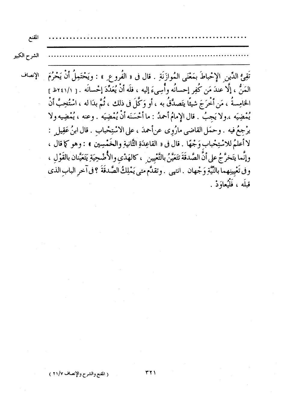 تَقِىُّ الدِّينِ الإِحْباطَ بمَعْنَى المُوازَنَةِ. قال فى «الفُروعِ»: ويَحْتَمِلُ أنْ يَحْرُمَ المَنُّ، إلَّا عندَ مَن كُفِر إحسانُه وأُسِئَ إليه، فلَه أنْ يُعَدِّدَ إحْسانَه. الخامِسةُ، مَن أخْرَجَ شيئًا يتَصدَّقُ به، أو وَكَّلَ فى ذلك، ثُمَّ بدَا له، اسْتُحِبَّ أنْ يُمْضِيَه، ولا يَجِبُ. قال الإِمامُ أحمدُ: ما أحْسَنَه أنْ يُمْضِيَه. وعنه، يُمْضِيه ولا يرْجِعُ فيه. وحمَل القاضى ما رُوِى عن أحمدَ، على الاسْتِحْبابِ. قال ابنُ عَقِيلٍ: لا أعلمُ للاسْتِحْباب وَجْهًا. قال فى «القاعِدَةِ الثَّانيةِ والخَمْسِين»: وهو كما قال، وإنَّما يتَخرَّجُ على أنَّ الصَّدقَةَ تتَعَيَّنُ بالتَّعْيِينِ، كالهَدْىِ والأُضْحِيَةِ يَتَعَيَّنان بالقَوْلِ، وفى تَعْيِينِهما بالنِّيَّةِ وَجْهان. انتهى. وتقدَّم متى يَمْلِكُ الصَّدقَةَ؟ فى آخرِ البابِ الذى قبلَه، فَلْيُعاوَدْ.