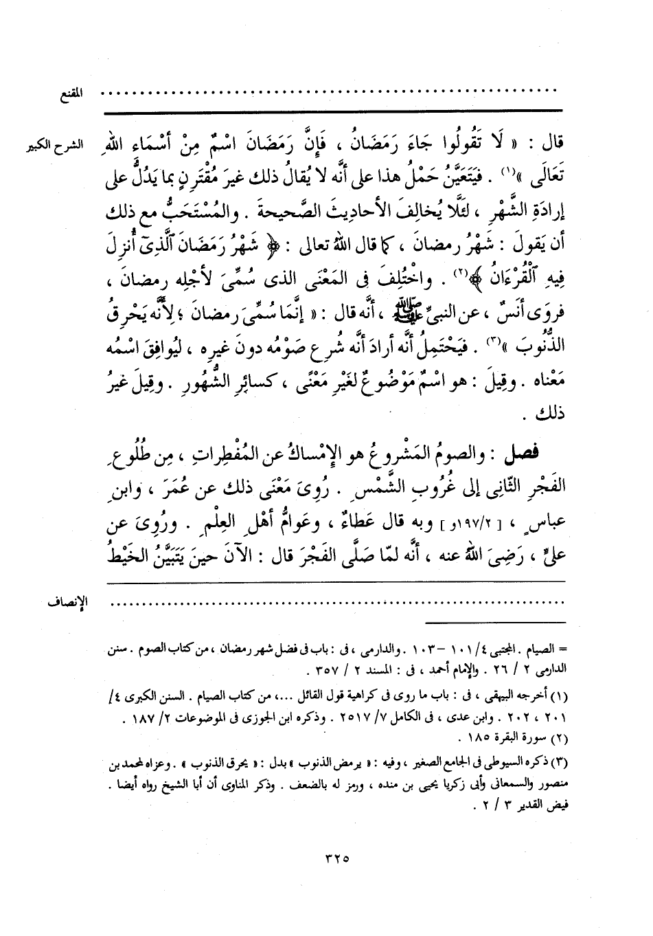 فصل: والصومُ المَشْروعُ هو الإِمْساكُ عن المُفْطِراتِ، مِن طُلُوعِ الفَجْرِ الثّانِى إلى غُرُوبِ الشَّمْسِ. رُوِى مَعْنَى ذلك عن عُمَرَ، وابنِ عباسٍ، وبه قال عَطاءٌ، وعَوامُّ أهْلِ العِلْمِ. ورُوِىَ عن علىٍّ، رَضِىَ اللَّه عنه، أنَّه لمّا صَلَّى الفَجْرَ قال: الآنَ حينَ يَتَبَيَّنُ الخَيْطُ
