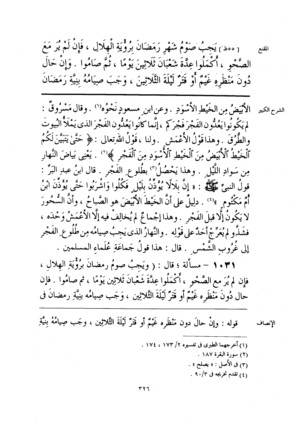 يَجبُ صَوْمُ شَهْرِ رَمَضَانَ بِرُؤْيَةِ الْهِلَالِ، فَإِنْ لَمْ يُرَ مَعَ الصَّحْوِ، أَكْمَلُوا عِدَّةَ شَعْبَانَ ثَلَاثِينَ يَوْمًا، ثمَّ صَامُوا. وَإن حَالَ دُونَ مَنْظرِهِ غَيْمٌ أوْ قَتَرٌ لَيْلَةَ الثَّلَاثِينَ، وَجَبَ صِيَامُهُ بِنِيَّةِ رَمَضَانَ