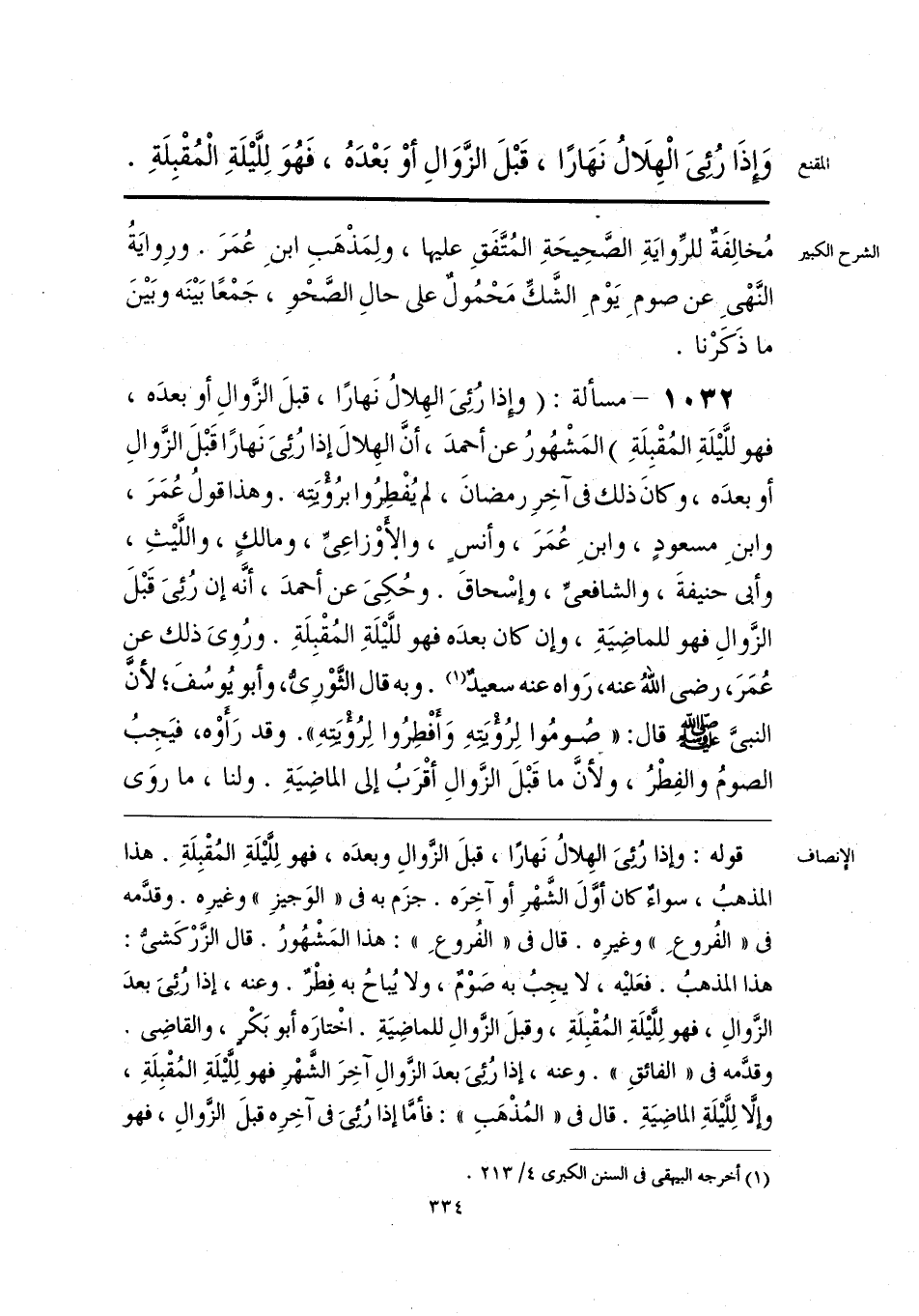 قوله: وإِذا رُئِىَ الهِلالُ نَهارًا، قبلَ الزَّوالِ وبعدَه، فهو لِلَّيْلَةِ المُقْبِلَةِ. هذا المذهبُ، سواء كان أوَّلَ الشَّهْرِ أو آخِرَه. جزَم به فى «الوَجيزِ» وغيرِه. وقدَّمه فى «الفُروعِ» وغيرِه. قال فى «الفُروعِ»: هذا المَشْهُورُ. قال الزَّرْكَشىُّ: هذا المذهبُ. فعَليْه، لا يجِبُ به صَوْمٌ، ولا يُباحُ به فِطْر. وعنه، إذا رُئِىَ بعدَ الزَّوالِ، فهو لِلَّيْلَةِ المُقْبِلَةِ، وقبلَ الزَّوالِ للماضِيَةِ. اخْتارَه أبو بَكْر، والقاضِى. وقدَّمه فى «الفائقِ». وعنه، إذا رُئِىَ بعدَ الزَّوالِ آخِرَ الشَّهْرِ فهو لِلَّيْلَةِ المُقْبِلَةِ، وإلَّا لِلَّيْلَةِ الماضِيَةِ. قال فى «المُذْهَبِ»: فأمَّا إذا رُئِىَ فى آخِرِه قبلَ الزَّوالِ، فهو