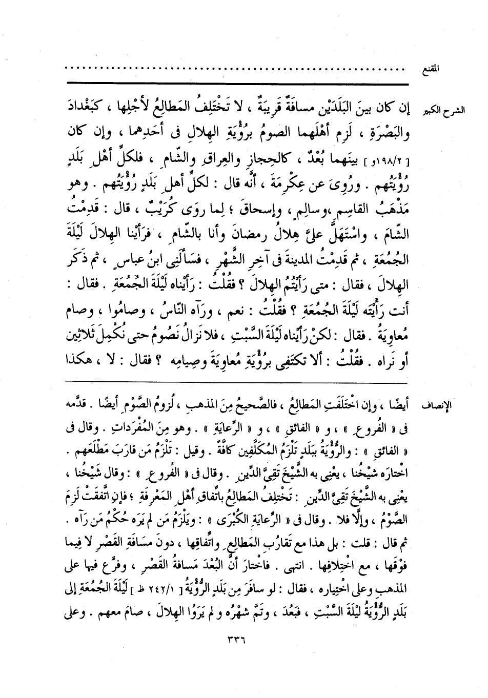 أيضًا، وإن اخْتَلَفَتِ المَطالِعُ، فالصَّحيحُ مِنَ المذهبِ، لُزومُ الصَّوْمِ أيضًا. قدَّمه فى «الفُروعِ»، و «الفائقِ»، و «الرِّعايَةِ». وهو مِنَ المُفْرَداتِ. وقال فى «الفائقِ»: والرُّؤْيَةُ ببَلَدٍ تَلْزَمُ المُكَلَّفِين كافَّةً. وقيل: تَلْزَمُ مَن قارَبَ مَطْلَعَهم. اخْتارَه شيْخُنا، يعْنى به الشيْخَ تَقِىَّ الدِّينِ. وقال فى «الفُروعِ»: وقال شَيْخُنا، يعْنِى به الشيْخَ تَقِىُّ الدِّينِ: تَخْتلِفُ المَطالِعُ باتِّفاقِ أهْلِ المَعْرِفَةِ؛ فإنِ اتَّفقَتْ لَزِمَ الصَّوْمُ، وإلَّا فلا. وقال فى «الرِّعايَةِ الكُبْرَى»: ويَلْزَمُ مَن لم يَرَه حُكْمُ مَن رَآه. ثم قال: قلت: بل هذا مع تَقارُبِ المَطالِعِ واتِّفاقِها، دونَ مسَافَةِ القَصْرِ لا فِيما فوْقَها، مع اخْتِلافِها. انتهى. فاخْتارَ أنَّ البُعْدَ مَسافةُ القَصْرِ، وفرَّع فيها على المذهب وعلى اختِياره، فقال: لو سافَرَ مِن بَلَدٍ الرُّؤْيَةُ لَيْلَةَ الجُمُعَةِ إلى بَلَدٍ الرُّؤْيَةُ ليْلَةَ السَّبْتِ، فبَعُدَ، وتَمَّ شهْرُه ولم يَرَوُا الهِلالَ، صامَ معهم. وعلى
