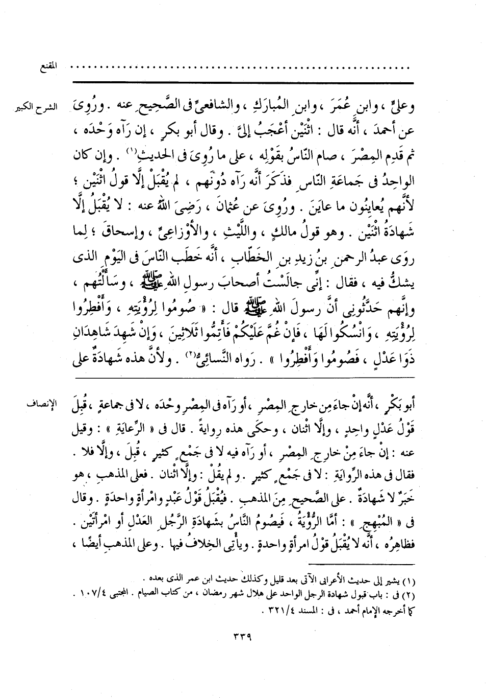 أبو بَكْرٍ، أنَّه إنْ جاءَ مِن خارجِ المِصْرِ، أو رَآه فى المِصْرِ وحْدَه، لا فى جماعةٍ، قُبِلَ قَوْلُ عَدْلٍ واحِدٍ، وإلَّا اثْنان، وحكَى هذه رِوايةً. قال فى «الرِّعايَةِ»: وقيل عنه: إنْ جاءَ مِنْ خارِجِ المِصْرِ، أو رَآه فيه لا فى جَمْعٍ كثير، قُبِلَ، وإلَّا فلا. فقال فى هذه الرِّوايَةِ: لا فى جَمْعٍ كثير. ولم يقُلْ: وإلَّا اثْنان. فعلى المذهبِ، هو خَبَرٌ لا شَهادَةٌ. على الصَّحيحِ مِنَ المذهبِ. فيُقْبَلُ قَوْلُ عَبْدٍ وامْرأةٍ واحدَةٍ. وقال فى «المُبْهِجِ»: أمَّا الرُّؤْيَةُ، فَيصُومُ النَّاسُ بشَهادَةِ الرَّجُلِ العَدْلِ أو امْرأتَيْن. فظاهِرُه، أنَّه لا يُقْبَلُ قوْلُ امرأةٍ واحدةٍ. ويأْتِى الخِلافُ فيها. وعلى المذهبِ أيضًا،