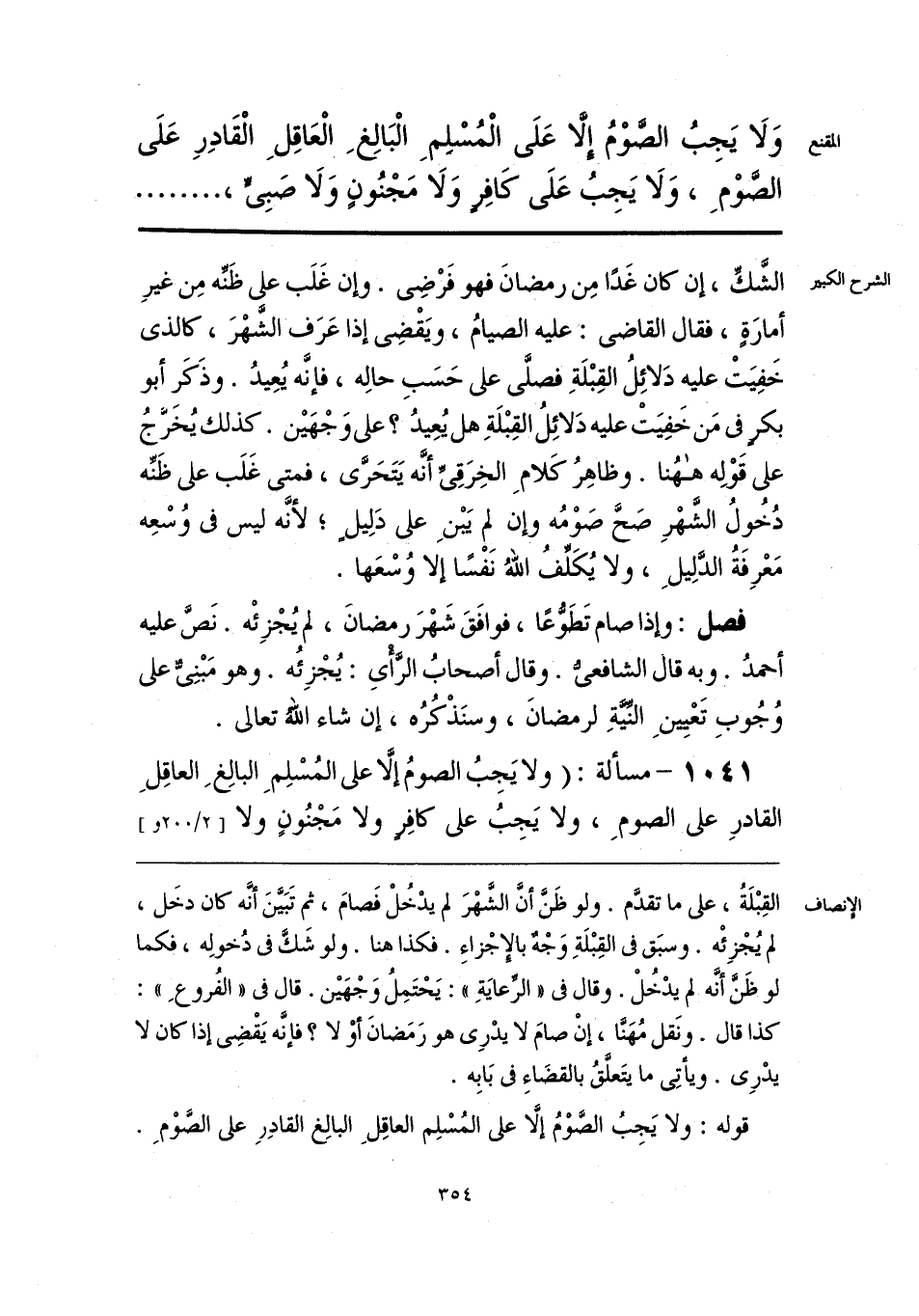 وَلَا يَجِبُ الصَّوْمُ إِلَّا عَلَى الْمُسْلِمِ الْبَالِغِ الْعَاقِلِ الْقَادِرِ عَلَى الصَّوْمِ، وَلَا يَجِبُ عَلَى كَافِرٍ وَلَا مَجْنُونٍ وَلَا صَبِىٍّ،