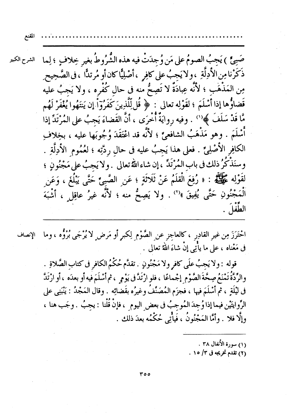 قوله: ولا يَجِبُ علَى كافرٍ ولا مَجْنُونٍ. تقدَّم حُكْمُ الكافرِ فى كتابِ الصَّلاةِ. والرِّدَّةُ تَمْنَعُ صِحَّةَ الصَّوْمِ إجْماعًا، فلو ارْتَدَّ فى يَوْمٍ، ثم أسْلَمَ فيه أو بعدَه، أو ارْتَدَّ فى ليْلَةٍ، ثم أسْلَمَ فيها، فجزَم المُصَنِّفُ وغيرُه بقَضائِه. وقال المَجْدُ: يَنْبَنِى على الرِّوايتَيْن فيما إذا وُجِدَ المُوجِبُ فى بعضِ اليومِ، فإنْ قُلْنا: يجِبُ. وجَب هنا، وإلَّا فلا. وأمَّا المَجْنُونُ، فَيأْتِى حُكْمُه بعدَ ذلك.