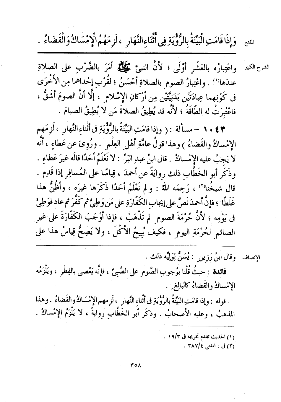 قوله: وإذا قامَتِ البَيِّنَةُ بالرُّؤْيَةِ فى أثْناء النَّهارِ، لَزِمهم الإِمْسَاكُ والقَضاءُ. وهذا المذهبُ، وعليه الأصحابُ. وذكَر أبَو الخَطَّابِ رِوايةً، لا يَلْزَمُ الإِمْساكُ.