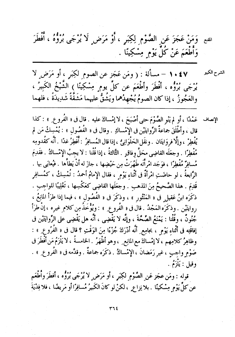 قوله: ومَن عجَز عَنِ الصَّوْمِ لكِبَرٍ، أو مَرَضٍ لا يُرْجَى بُرْؤُه، أفطَرَ وأَطْعَم عن كلِّ يَوْم مِسْكينًا. بلا نِزاعٍ، لكنْ لو كانَ الكَبيرُ مُسافِرًا أو مَرِيضًا، فلا فِدْيَةَ
