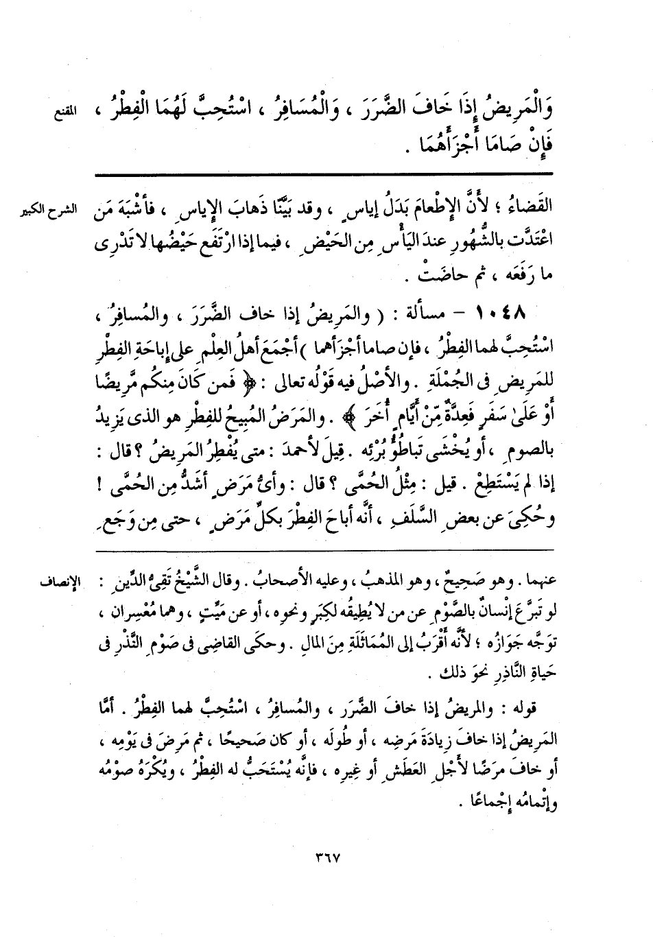 قوله: والمريضُ إذا خافَ الضَّرَر، والمُسافِرُ، اسْتُحِبَّ لهما الفِطْرُ. أمَّا المَرِيضُ إذا خافَ زِيادَةَ مَرضِه، أو طُولَه، أو كان صَحيحًا، ثم مَرِضَ فى يَوْمِه، أو خافَ مرَضًا لأَجْلِ العَطَشِ أو غِيرِه، فإنَّه يُسْتَحَبُّ له الفِطْرُ، ويُكْرَهُ صوْمُه وإتْمامُه إِجْماعًا.