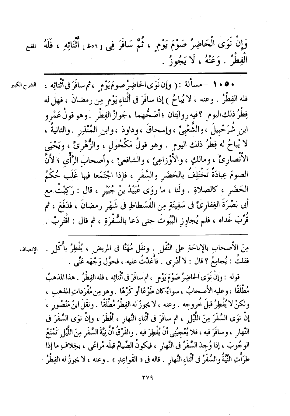 قوله: وإنْ نَوَى الحاضِرُ صَوْمَ يَوْمٍ، ثم سافَرَ فى أثْنائِه، فله الفِطْرُ. هذا المذهبُ مُطْلَقًا، وعليه الأصحابُ، سواءٌ كان طَوْعًا أو كَرْهًا. وهو مِن مُفْرَداتِ المذهبِ، ولكنْ لا يُفْطِرُ قبلَ خُروجِه. وعنه، لا يجوزُ له الفِطْرُ مُطْلَقًا. ونقَلَ ابنُ مَنْصُورٍ، إنْ نوَى السَّفَرَ مِنَ اللَّيْلِ، ثم سافَرَ فى أثْناءِ النَّهارِ، أفْطَرَ، وإنْ نوَى السَّفَرَ فى النَّهارِ، وسافَرَ فيه، فلا يُعْجِبُنِى أنْ يُفْطِرَ فيه. والفَرْقُ أنَّ نِيَّةَ السَّفَرِ مِنَ اللَّيْلِ تَمْنَعُ الوجُوبَ، إذا وُجِدَ السَّفَرُ فى النَّهارِ، فيكونُ الصِّيامُ قبلَه مُراعًى، بخِلافِ ما إذا طرَأَتِ النِّيَّةُ والسَّفَرُ فى أثْناءِ النَّهارِ. قاله فى «القَواعِدِ». وعنه، لا يجوزُ له الفِطْرُ