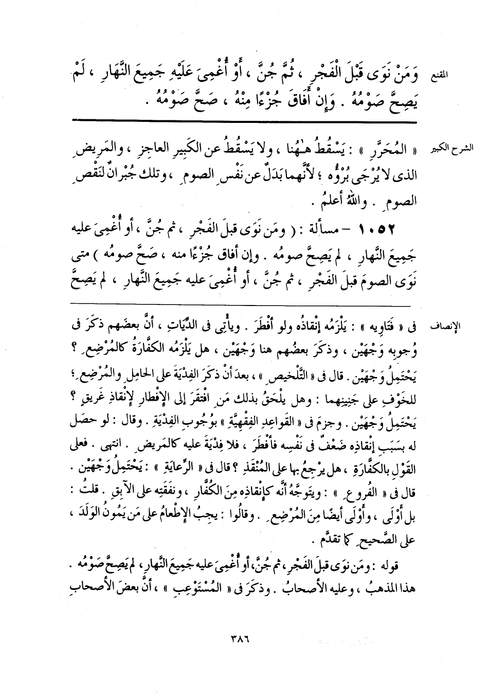 وَمَنْ نَوَى قَبْلَ الْفَجْر، ثُمَّ جُنَّ، أَوْ أُغْمِىَ عَلَيْهِ جَمِيعَ النَّهَارِ، لَمْ يَصِحَّ صَوْمُهُ. وَإِنْ أَفاقَ جُزْءًا مِنْهُ، صَحَّ صَوْمُهُ.