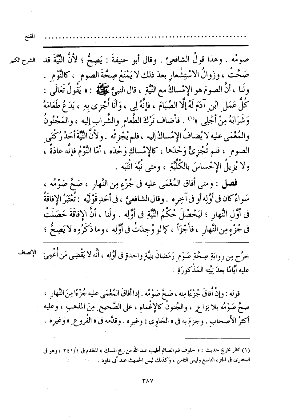 قوله: وإنْ أَفاقَ جُزْءًا مِنه، صَحَّ صَوْمُه. إذا أفاقَ المُغْمَى عليه جُزْءًا مِنَ النَّهارِ، صحَّ صَوْمُه بلا نِزاعٍ، والجُنونُ كالإِغْماءِ، على الصَّحيحِ مِنَ المذهبِ، وعليه أكثرُ الأصحابِ. وجزمَ به في «الحَاوِي» وغيرِه. وقدَّمه في «الفُروعِ» وغيرِه.