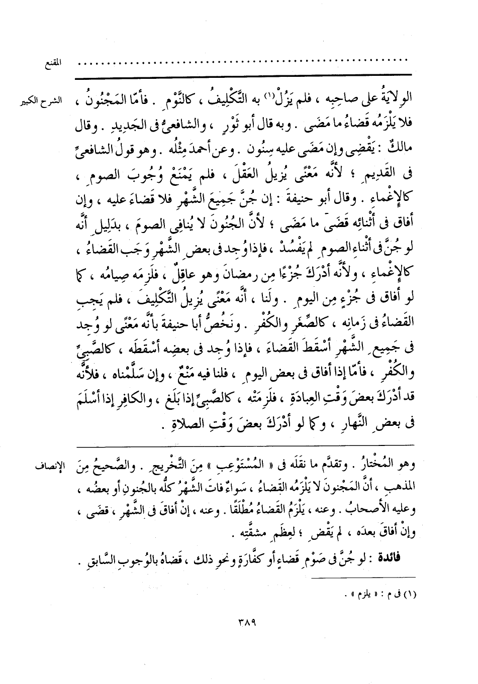 وهو المُخْتارُ. وتقدَّم ما نقَلَه في «المُسْتَوْعِبِ» مِنَ التَّخْريجِ. والصَّحيحُ مِنَ المذهبِ، أنَّ المَجْنونَ لا يَلْزَمُه القضاءُ، سَواءٌ فاتَ الشَّهْرُ كلُّه بالجُنونِ أو بعضُه، وعليه الأصحابُ. وعنه، يَلْزَمُ القَضاءُ مُطْلَقًا. وعنه، إنْ أفاقَ في الشَّهْرِ، قضَى، وإنْ أفاقَ بعدَه، لم يَقْضِ؛ لعِظَمِ مشقَّتِه.