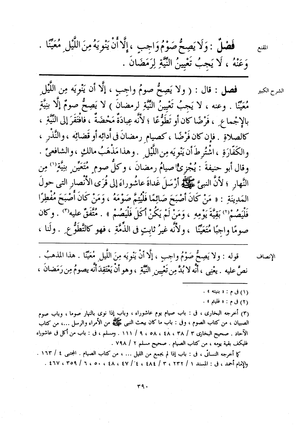 فَصْلٌ: وَلَا يَصِحُّ صَوْمُ وَاجِبٍ، إِلَّا أنْ يَنْوِيَهُ مِنَ اللَّيْلِ مُعَيِّنًا. وَعَنْهُ، لَا يَجِبُ تَعْيِينُ النِّيَّةِ لِرَمَضَانَ.