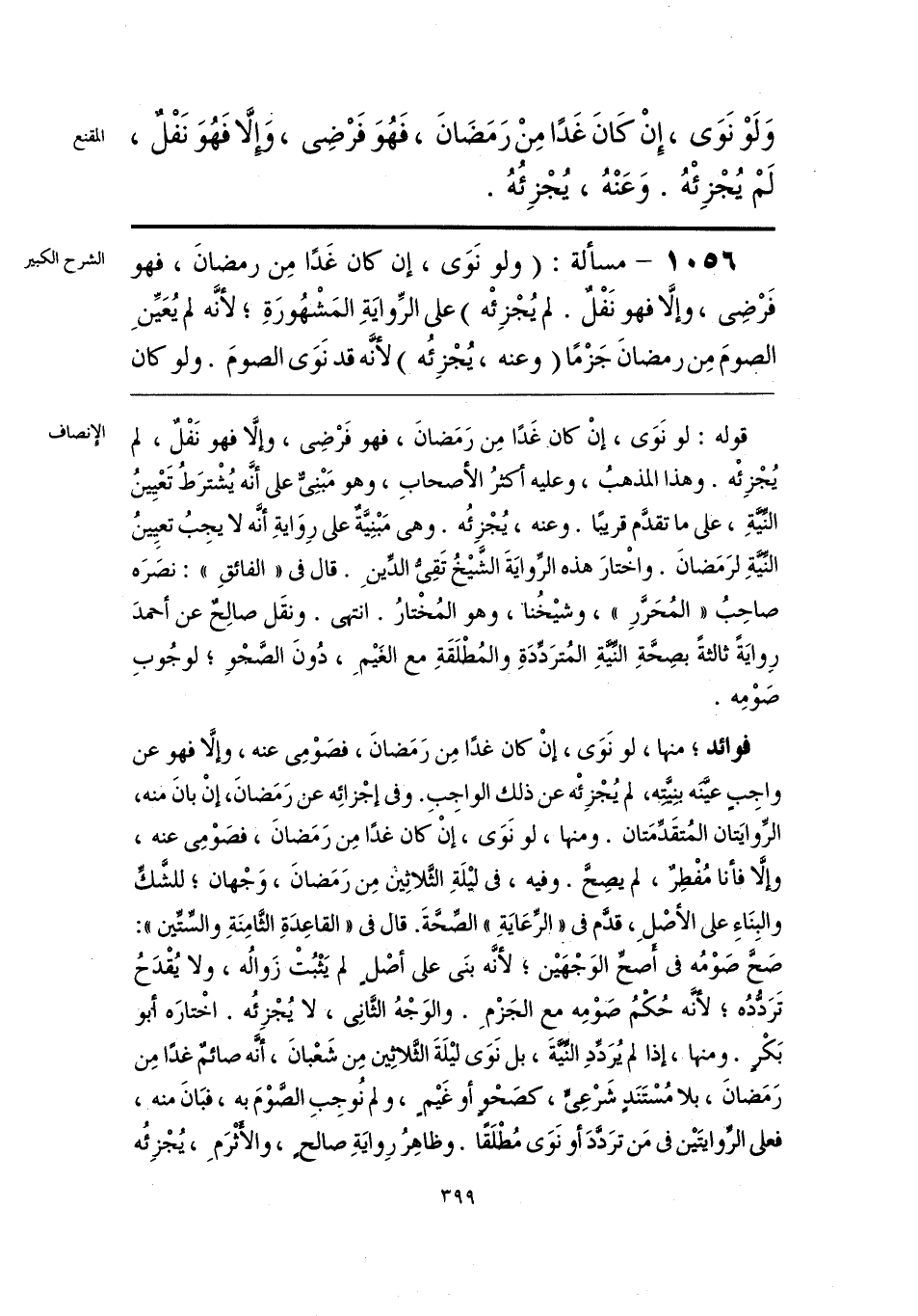 قوله: لو نَوَى، إنْ كان غَدًا مِن رَمَضانَ، فهو فَرْضِى، وإلَّا فهو نَفْلٌ، لم يُجْزِئْه. وهذا المذهبُ، وعليه أكثرُ الأصحابِ، وهو مَبْنِيٌّ على أنَه يُشْترَطُ تَعْيِينُ النِّيَّةِ، على ما تقدَّم قريبًا. وعنه، يُجْزِئُه. وهي مَبْنِيَّةٌ على رِوَايةِ أنَّه لا يجِبُ تعيِينُ النِّيَّةِ لرَمَضانَ. واخْتارَ هذه الرِّوايَةَ الشَّيْخُ تَقِىُّ الدِّينِ. قال فى «الفائقِ»: نصَرَه صاحِبُ «المُحَرَّرِ»، وشيْخُنا، وهو المُخْتارُ. انتهى. ونقَل صالِحٌ عن أحمدَ رِوايَةً ثالثةً بصِحَّةِ النِّيَّةِ المُترَدِّدَةِ والمُطْلَقَةِ مع الغَيْمِ، دُونَ الصَّحْوِ؛ لوجُوبِ صَوْمِه.