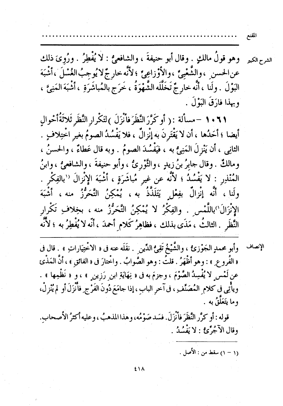قوله: أو كرَّر النَّظَرَ فأنْزَلَ. فسَد صَوْمُه، وهذا المذهبُ، وعليه أكثرُ الأصحابِ. وقال الآجُرِّىُّ: لا يَفْسُدُ.