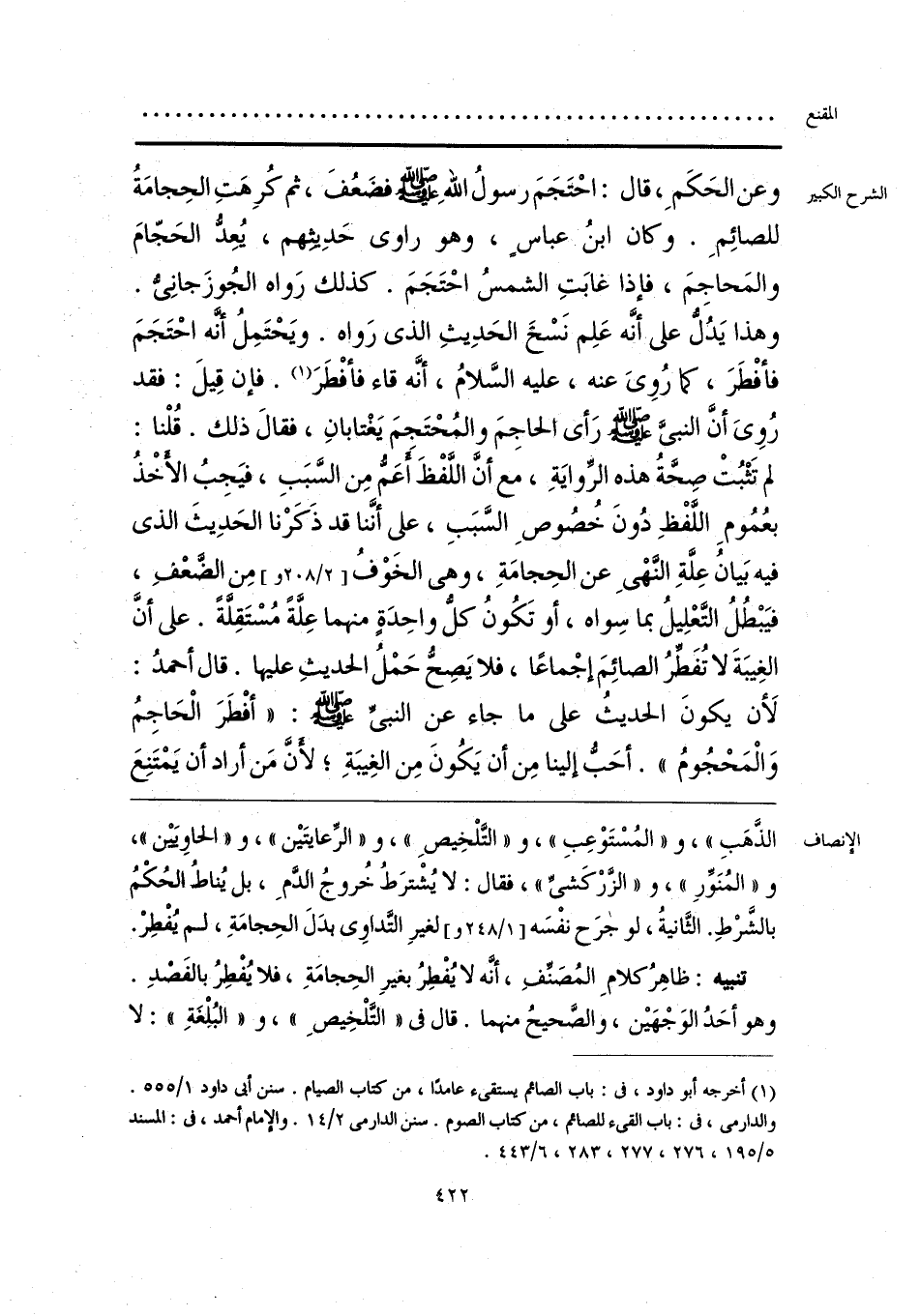 الذَّهَبِ»، و «المُسْتَوْعِبِ»، و «التَّلْخِيصِ»، و «الرِّعايتَيْن»، و «الحاوِيَيْن»، و «المُنَوِّرِ»، و «الزَّرْكَشىِّ»، فقال: لا يُشْترَطُ خُروجُ الدَّمِ، بل يُناطُ الحُكْمُ بالشَّرْطِ. الثَّانيةُ، لو جرَح نفْسَه لغيرِ التَّداوِى بدَلَ الحِجامَةِ، لم يُفْطِرْ.