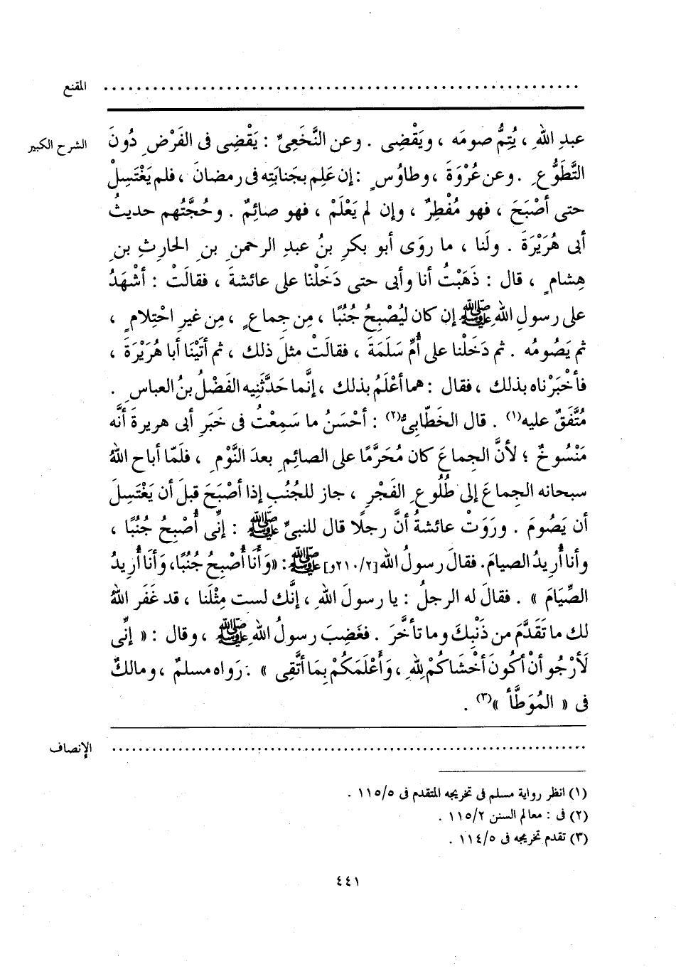عبدِ اللهِ، يُتِمُّ صومَه، ويَقْضِى. وعن النَّخَعِىِّ: يَقْضِى في الفَرْضِ دُونَ التَّطَوُّعِ. وعن عُرْوَةَ، وطاوُسٍ: إن عَلِم بجَنابَتِه في رمضانَ، فلم يَغْتَسِلْ حتى أصْبَحَ، فهو مُفْطِرٌ، وإن لم يَعْلَمْ، فهو صائِمٌ. وحُجَّتُهم حديثُ أبى هُرَيْرَةَ. ولَنا، ما روَى أبو بكرِ بنُ عبدِ الرحمنِ بنِ الحارِثِ بنِ هِشامٍ، قال: ذَهَبْتُ أنا وأبى حتى دَخَلْنا على عائشةَ، فقالَتْ: أشْهَدُ على رسولِ اللهِ - صلى الله عليه وسلم - إن كان ليُصْبِحُ جُنُبًا، مِن جِماع، مِن غيرِ احْتِلامٍ، ثم يَصُومُه. ثم دَخَلْنا على أُمِّ سَلَمَةَ، فقالَتْ مثلَ ذلك، ثم أتَيْنَا أبا هُرَيْرَةَ، فأخْبَرْناه بذلك، فقال: هما أعْلَمُ بذلك، إنَّما حَدَّثَنِيه الفَضْلُ بنُ العباسِ. مُتَّفَقٌ عليه (¬1). قال الخَطّابِىُّ (¬2): أحْسَنُ ما سَمِعْتُ في خَبَرِ أبي هريرةَ أنَّه مَنْسُوخٌ؛ لأنَّ الجِماعَ كان مُحَرَّمًا على الصائِمِ بعدَ النَّوْمِ، فلَمّا أباح اللهُ سبحانه الجِماعَ إلى طُلُوعِ الفَجْرِ، جاز للجُنُب إذا أصْبَحَ قبلَ أن يَغْتَسِلَ أن يَصُومَ. ورَوَتْ عائشةُ أنَّ رجلًا قال للنبىَّ - صلى الله عليه وسلم -: إنِّى أُصْبِحُ جُنُبًا، وأنا أُرِيدُ الصيامَ. فقالَ رسولُ الله - صلى الله عليه وسلم -: «وَأَنَا أُصْبِحُ جُنبًا، وَأنَا أُرِيدُ الصِّيَامَ». فقالَ له الرجلُ: يا رسولَ اللهِ، إنَّك لست مِثْلَنا، قد غَفَر اللهُ لك ما تَقَدَّمَ من ذَنْبِكَ وما تأخَّرَ. فغَضِبَ رسولُ الله - صلى الله عليه وسلم -، وقال: «إنِّى لَأرْجُو أنْ أكُونَ أخْشَاكُمْ للهِ، وَأَعْلَمَكُمْ بِمَا أتَّقِى». رَواه مسلمٌ، ومالكٌ في «المُوَطَّأ» (¬3).