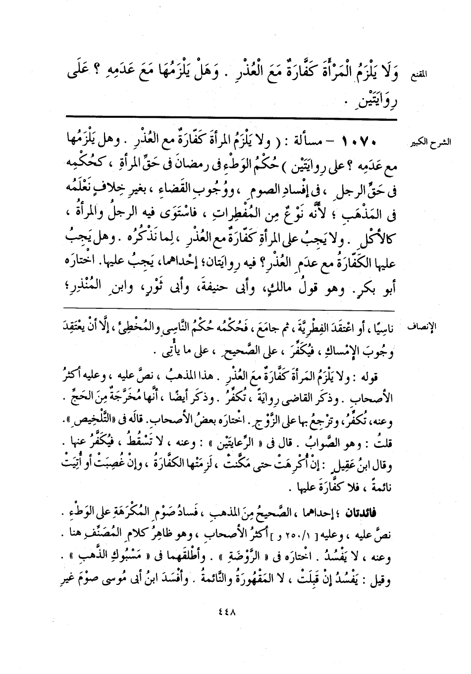 وَلَا يَلْزَمُ الْمَرْأةَ كَفَّارَةٌ مَعَ الْعُذْرِ. وَهَل يَلْزَمُهَا مَعَ عَدَمِهِ؟ عَلَى رِوَايَتَيْنَ.