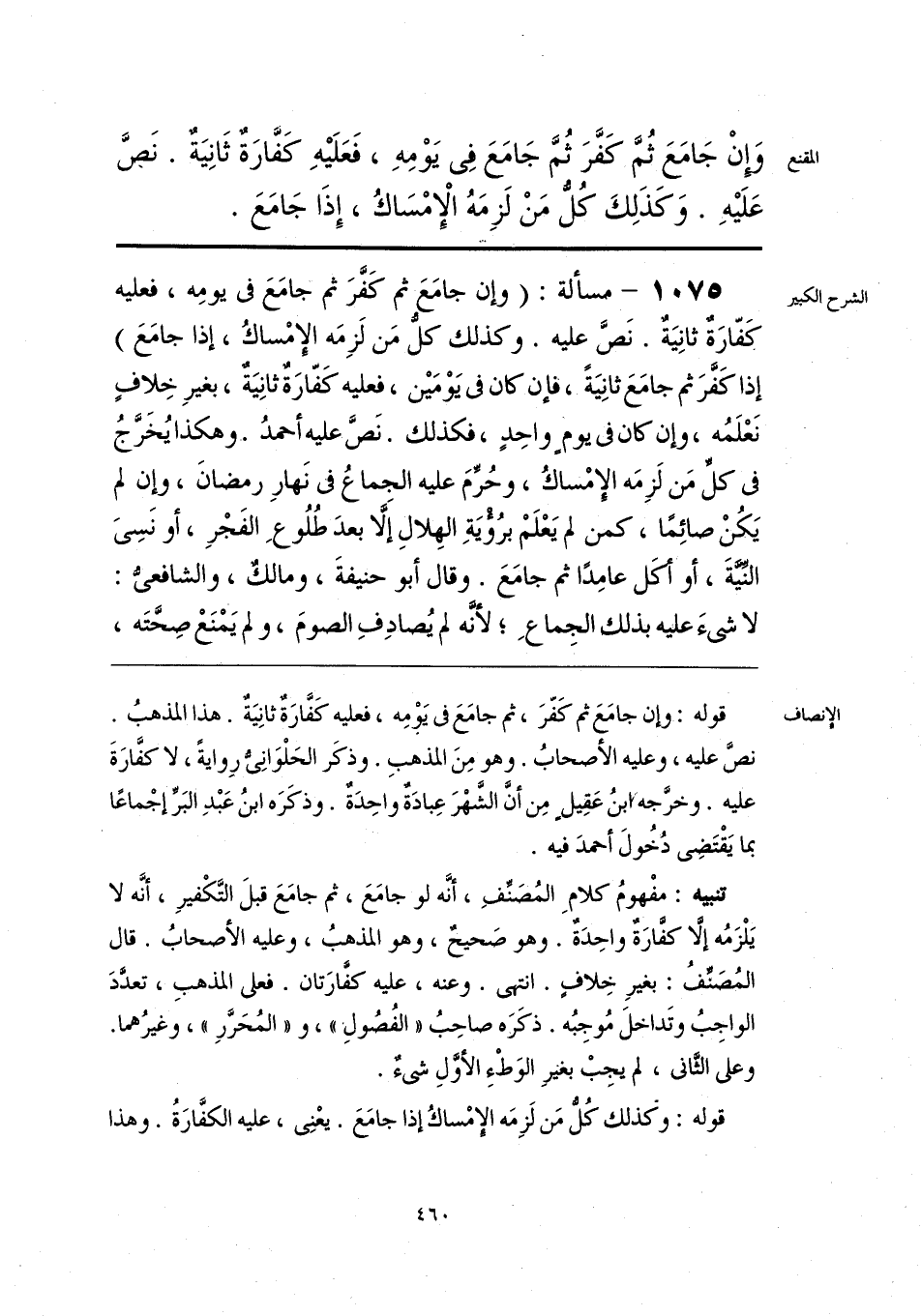 تنبيه: مفْهومُ كلامِ المُصَنِّفِ، أنَّه لو جامَعَ، ثم جامَعَ قبلَ التَّكْفيرِ، أنَّه لا يَلْزَمُه إلَّا كفَّارَةٌ واحِدَةٌ. وهو صَحيحٌ، وهو المذهبُ، وعليه الأصحابُ. قال المُصَنِّفُ: بغيرِ خِلافٍ. انتهى. وعنه، عليه كفَّارَتان. فعلى المذهبِ، تعدَّدَ الواجِبُ وتَداخلَ مُوجِبُه. ذكَرَه صاحِبُ «الفُصُولِ»، و «المُحَرَّرِ»، وغيرُهما. وعلى الثَّانى، لم يجِبْ بغيرِ الوَطْءِ الأوَّلِ شئٌ.