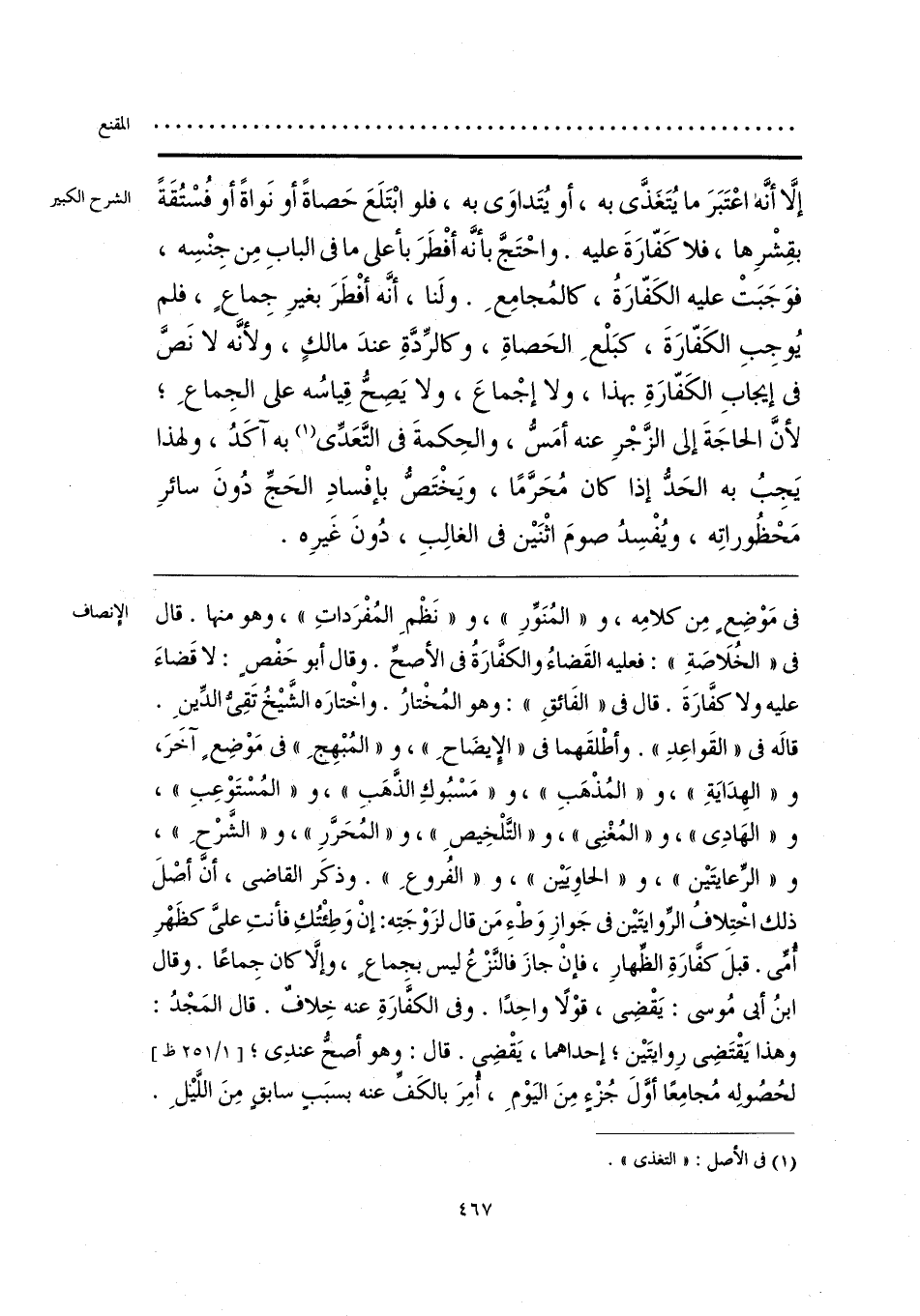 فى مَوْضِعٍ مِن كلامِه، و «المُنَوِّرِ»، و «نَظْمِ المُفْرَداتِ»، وهو منها. قال فى «الخُلَاصَةِ»: فعليه القَضاءُ والكفَّارَةُ فى الأصحِّ. وقال أبو حَفْصٍ: لا قَضاءَ عليه ولا كفَّارَةَ. قال فى «الفَائقِ»: وهو المُخْتارُ. واخْتارَه الشَّيْخُ تَقِىُّ الدِّينِ. قالَه فى «القَواعِدِ». وأطْلقَهما فى «الإِيضَاحِ»، و «المُبْهِجِ» فى مَوْضِعٍ آخَرَ، و «الهِدَايَةِ»، و «المُذْهَبِ»، و «مَسْبُوكِ الذَّهَبِ»، و «المُسْتَوْعِبِ»، و «الهَادِى»، و «المُغْنِى»، و «التَّلْخِيصِ»، و «المُحَرَّرِ»، و «الشَّرْحِ»، و «الرِّعايتَيْن»، و «الحاوِيَيْن»، و «الفُروعِ». وذكَر القاضى، أنَّ أصْلَ ذلك اخْتِلافُ الرِّوايتَيْن فى جَوازِ وَطْءِ مَن قال لزَوْجَتِه: إنْ وَطِئْتُكِ فأنتِ علىَّ كظَهْرِ أُمِّى. قبلَ كفَّارَةِ الظِّهارِ، فإنْ جازَ فالنَّزْعُ ليس بجِماعٍ، وإلَّا كان جِماعًا. وقال ابنُ أبى مُوسى: يَقْضِى، قوْلًا واحِدًا. وفى الكفَّارَةِ عنه خِلافٌ. قال المَجْدُ: وهذا يَقْتَضِى رِوايتَيْن؛ إحداهما، يَقْضِى. قال: وهو أصحُّ عندِى؛ لحُصُولِه مُجامِعًا أوَّلَ جُزْءٍ مِنَ اليَوْمِ، أُمِرَ بالكَفِّ عنه بسبَبٍ سابقٍ مِنَ اللَّيْلِ.