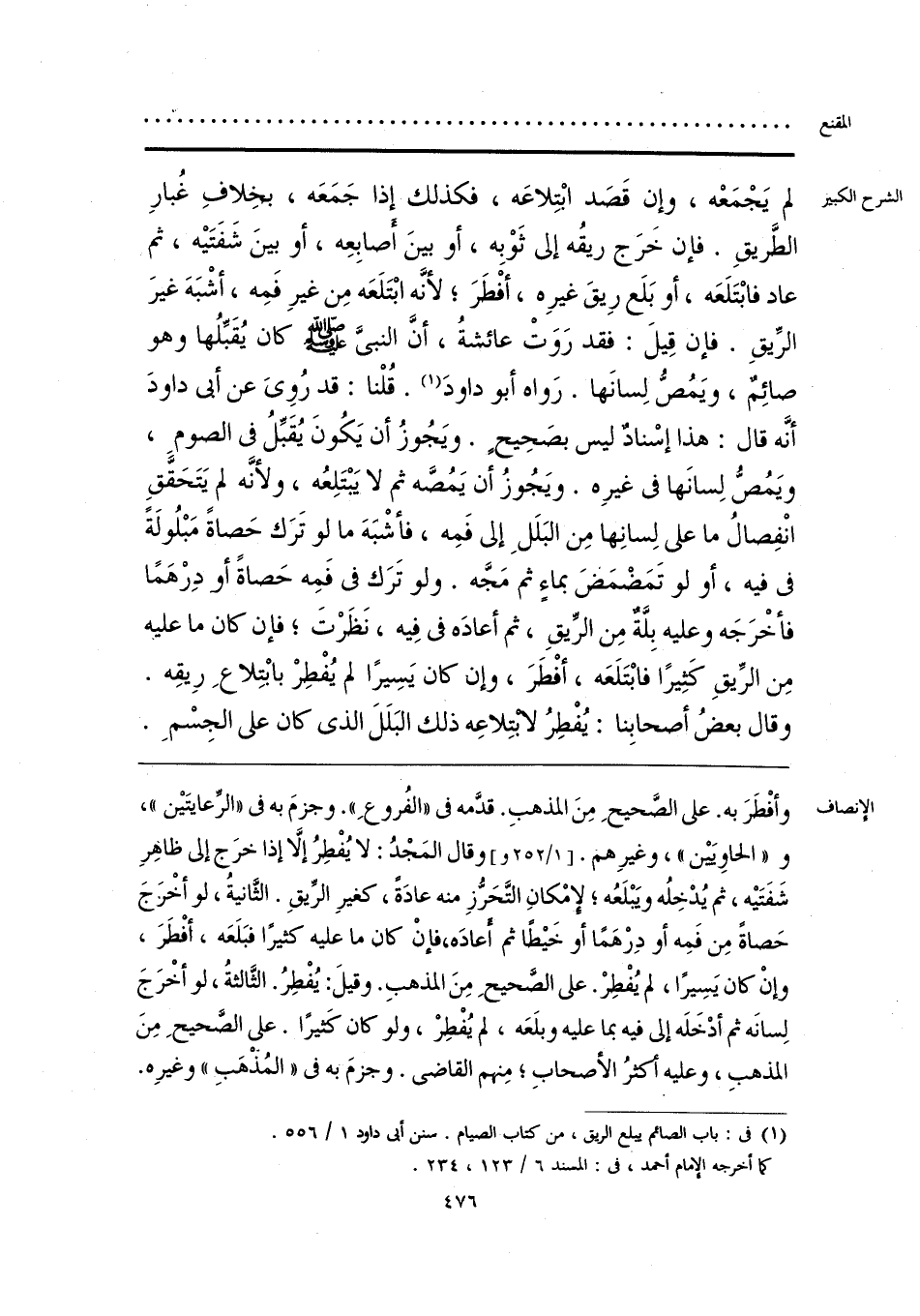 وأفْطَرَ به. على الصَّحيحِ مِنَ المذهبِ. قدَّمه فى «الفُروعِ». وجزمَ به فى «الرِّعايتَيْن»، و «الحاوِيَيْن»، وغيرِهم. وقال المَجْدُ: لا يُفْطِرُ إلَّا إذا خرَج إلى ظاهِرِ شَفَتَيْه، ثم يُدْخِلُه ويَبْلَعُه؛ لإِمْكانِ التَّحَرُّزِ منه عادَةً، كغيرِ الرِّيقِ. الثَّانيةُ، لو أخْرَجَ حَصاةً مِن فَمِه أو دِرْهَمًا أو خَيْطًا ثم أَعادَه، فإنْ كان ما عليه كثيرًا فبَلَعَه، أفْطَرَ، وإنْ كان يَسِيرًا، لم يُفْطِرْ. على الصَّحيحِ مِنَ المذهبِ. وقيلَ: يُفْطِرُ. الثَّالثةُ، لو أخْرَجَ لِسانَه ثم أدْخَلَه إلى فيه بما عليه وبلَعَه، لم يُفْطِرْ، ولو كان كثيرًا. على الصَّحيحِ مِنَ المذهبِ، وعليه أكثرُ الأصحابِ؛ مِنهم القاضى. وجزمَ به فى «المُذهَبِ» وغيرِه.