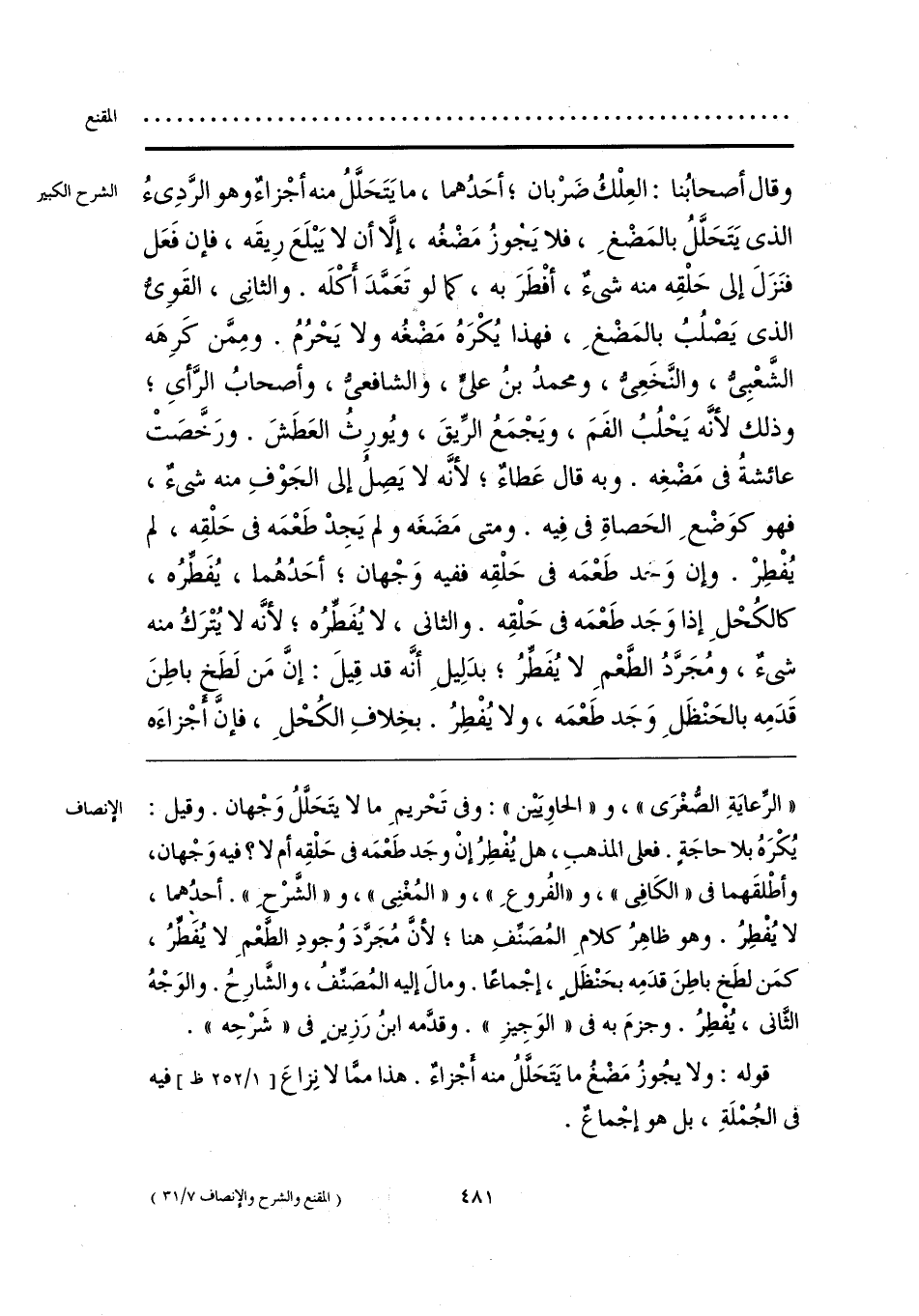 «الرِّعايَةِ الصُّغْرَى»، و «الحاوِيَيْن»: وفى تَحْريمِ ما لا يتَحَلَّلُ وَجْهان. وقيل: يُكْرَهُ بلا حاجَةٍ. فعلى المذهبِ، هل يُفْطِرُ إنْ وجَد طَعْمَه فى حَلْقِه أم لا؟ فيه وَجْهان، وأطْلقَهما فى «الكَافِى»، و «الفُروعِ»، و «المُغْنِى»، و «الشَّرْحِ». أحدُهما، لا يُفْطِرُ. وهو ظاهِرُ كلامِ المُصَنِّفِ هنا؛ لأنَّ مُجَرَّدَ وُجودِ الطَّعْمِ لا يُفَطِّرُ، كمَن لطَخ باطِنَ قدَمِه بحَنْظَلٍ، إجْماعًا. ومالَ إليه المُصَنِّفُ، والشَّارِحُ. والوَجْهُ الثَّانى، يُفْطِرُ. وجزمَ به فى «الوَجيزِ». وقدَّمه ابنُ رَزِينٍ فى «شَرْحِه».
