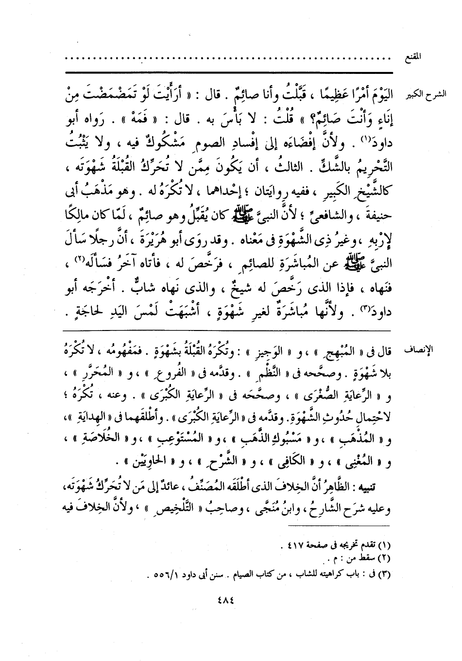 قال فى «المُبْهِجِ» , و «الوَجِيزِ»: وتُكْرَهُ القُبْلَةُ بشَهْوَةٍ. فمَفْهُومُه، لا تُكْرَهُ بلا شَهْوَةٍ. وصحَّحه فى «النَّظْمِ». وقدَّمه فى «الفُروعِ»، و «المُحَرَّرِ»، و «الرِّعايَةِ الصُّغْرَى»، وصحَّحَه فى «الرِّعايَةِ الكُبْرَى». وعنه، تُكْرَهُ؛ لاحْتِمالِ حُدُوثِ الشَّهْوَةِ. وقدَّمه فى «الرِّعايَةِ الكُبْرَى». وأطْلقَهما فى «الهِدايَةِ»، و «المُذْهَبِ»، و «مَسْبُوكِ الذَّهَبِ»، و «المُسْتَوْعِبِ»، و «الخُلَاصَةِ»، و «المُغْنِى»، و «الكَافِى»، و «الشَّرْحِ»، و «الحاوِيَيْن».