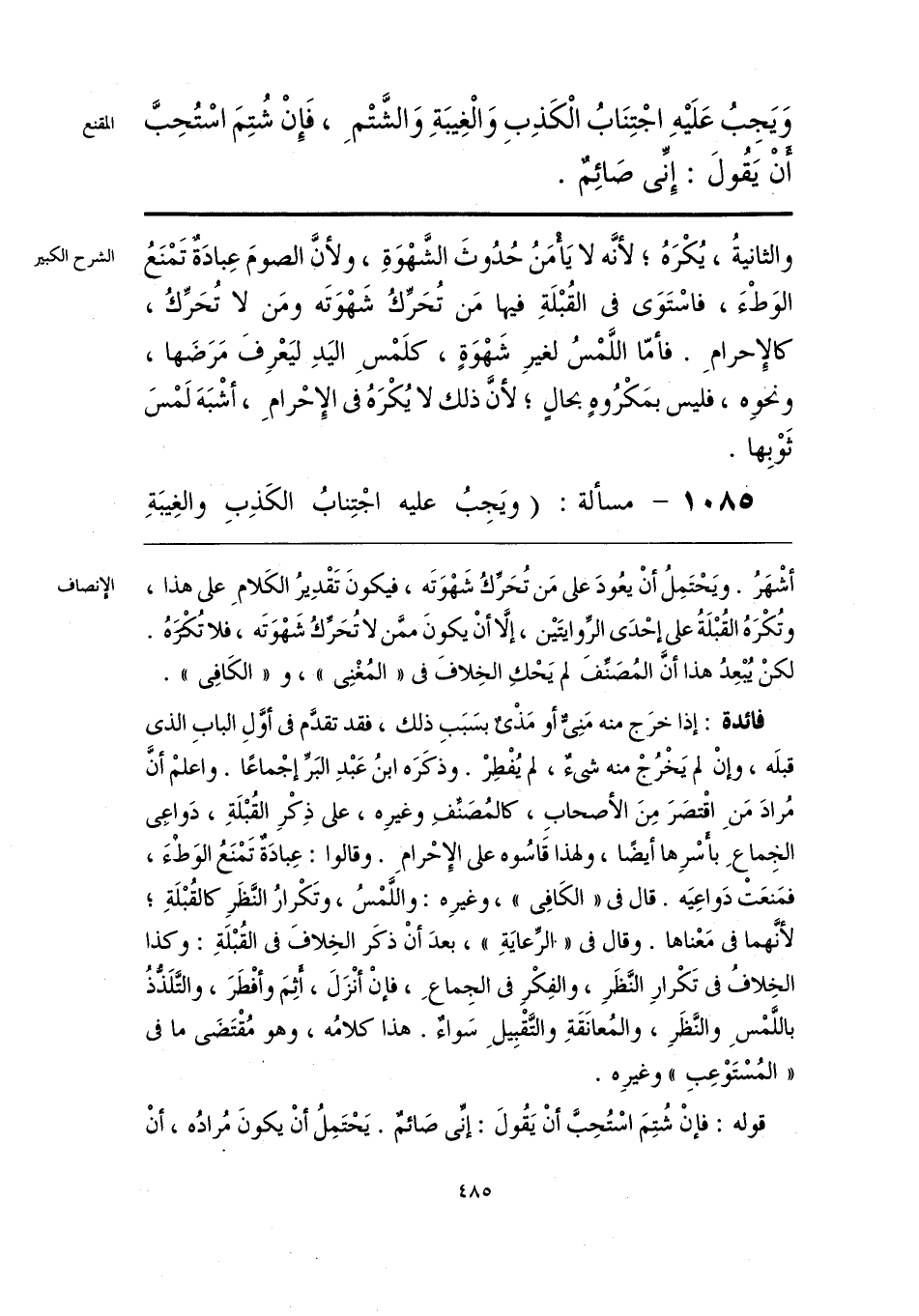 فائدة: إذا خرَج منه مَنِىٌّ أو مَذْىٌ بسَبَبِ ذلك، فقد تقدَّم فى أوَّلِ البابِ الذى قبلَه، وإنْ لم يَخْرُجْ منه شئٌ، لم يُفْطِرْ. وذكَرَه ابنُ عَبْدِ البَرِّ إجْماعًا. واعلمْ أنَّ مُرادَ مَنِ اقْتصَرَ مِنَ الأصحابِ، كالمُصَنِّفِ وغيرِه، على ذِكْرِ القُبْلَةِ، دَواعِى الجماعِ بأَسْرِها أيضًا, ولهذا قَاسُوه على الإِحْرامِ. وقالوا: عِبادَةٌ تَمْنَعُ الوَطْءَ، فمَنعَتْ دَواعِيَه. قال فى «الكَافِى»، وغيرِه: واللَّمْسُ، وتَكْرارُ النَّظَرِ كالقُبْلَةِ؛ لأنَّهما فى مَعْناها. وقال فى «الرِّعايَةِ»، بعدَ أنْ ذكَر الخِلافَ فى القُبْلَةِ: وكذا الخِلافُ فى تَكْرارِ النَّظَرِ، والفِكْرِ فى الجِماعِ، فإنْ أنْزَلَ، أَثِمَ وأفْطَرَ، والتَّلَذُّذُ باللَّمْسِ والنَّظَرِ، والمُعانَقَةِ والتَّقْبِيلِ سَواءٌ. هذا كلامُه، وهو مُقتَضَى ما فى «المُسْتَوْعِبِ» وغيرِه.
