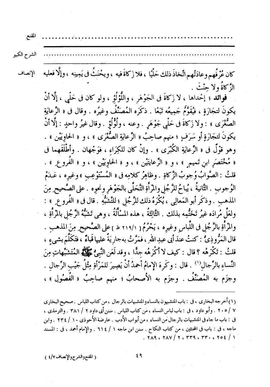 فوائد؛ إحْداها, لا زَكاةَ فى الجَوْهَرِ، واللُّؤلُؤِ، ولو كان فى حَلْى، إلَّا أنْ يكونَ لتجَارَةٍ، فيُقَوَّمُ جَمِيعُه تَبَعًا. ذكَرَه المُصَنِّفُ وغيرُه. وقال فى «الرِّعايَةِ الصُّغْرَى»: ولا زَكاةَ فى حَلْى جَوْهَرٍ. وعنه، ولُؤْلُؤٍ. وقال غيرُ واحدٍ: إلَّا أنْ يكونَ لتجَارَةٍ أو سَرَفٍ؛ منهم صاحِبُ «الرِّعايَةِ الصُّغْرَى»، و «الحاوِيَيْن». وهو قوْلٌ فى «الرِّعَايَةِ الكُبْرَى». وإنْ كان للكِرَاءِ، فوَجْهان. وأطْلَقَهما فى «مُخْتَصَرِ ابنِ تَميمٍ»، و «الرِّعايَتَيْن»، و «الحاوِيَيْن»، و «الفُروعِ». قلتُ: الصَّوابُ وُجوبُ الزَّكاةِ. وظاهِرُ كلامِه فى «المُسْتَوْعِبِ» وغيرِه، عَدَمُ الوُجوبِ. الثَّانيةُ، يُباحُ للرَّجُلِ والمرْأةِ التَّحَلِّى بالجَوْهَرِ ونحوِه. على الصَّحيحِ مِنَ المذهبِ. وذكَر أبو المَعالِى، يُكْرَهُ ذلك للرَّجُلِ؛ للتَّشَبُّهِ. قال فى «الفُروعِ»: ولعَلَّ مُرادَه غيرُ تَخَتُّمِه بذلك. الثَّالِثَةُ، هذه المسْأَلةُ، وهي تَشَبُّهُ الرَّجُلِ بالمرْأَةِ، والمرْأَةِ بالرَّجُلِ فى اللِّباسِ وغيرِه، يَحْرُمُ على الصَّحيحِ مِنَ المذهبِ. قال المَرُّوذِىُّ: كنتُ عندَ أبى عبدِ اللَّهِ، فمَرَّتْ به جارِيَةٌ عليها قَباءٌ، فتَكَلَّمَ بشئٍ، قلتُ: تَكْرَهُه؟ قال: كيف لا أكْرَهُه جدًا، وقد لَعَن النَّبِىُّ -صلى اللَّه عليه وسلم- المُتَشَبِّهاتِ مِنَ النِّساءِ بالرِّجالِ (¬1). قال: وكَرِهَ الإِمامُ أَحمدُ أنْ يَصيرَ للمَرْأةِ مِثْلُ جَيْبِ الرِّجالِ. وجزَم به المُصَنِّفُ. وجزَم به الأصحابُ؛ منهم صاحِبُ «الفُصُولِ»،