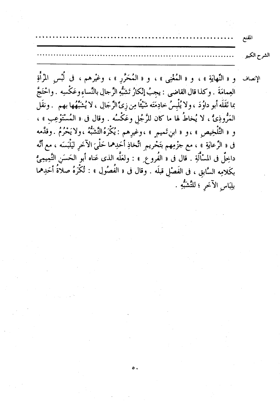 و «النِّهايَةِ»، و «المُغْنِى»، و «المُحَرَّرِ»، وغيْرهم، فى لُبْسِ المرْأَةِ العِمامَةَ. وكذا قال القاضى: يجِبُ إنْكارُ تَشَبُّهِ الرِّجالِ بالنِّساءِ وعَكْسِه. واحْتَجَّ بما نَقَلَه أبو داوُدَ، ولا يُلْبِسُ خادِمَتَه شَيْئًا مِن زِىِّ الرِّجَالِ، لا يُشَبِّهُها بهم. ونقَل المَرُّوذِىُّ، لا يُخاطُ لها ما كان للرجُلِ وعَكْسُه. وقال فى «المُسْتَوْعِبِ»، و «التَّلْخِيص»، و «ابنِ تَميمٍ»، وغيرِهم: يُكْرَهُ التَّشَبُّهُ، ولا يَحْرُمُ. وقدَّمه فى «الرِّعايَةِ»، مع جزْمِهم بتَحْريمِ اتِّخاذِ أحَدِهما حَلْى الآخَرِ ليَلْبَسَه، مع أنَّه داخِلٌ فى المسْأَلةِ. قال فى «الفُروعِ»: ولعَلَّه الذى عَناه أبو الحَسَنِ التَّمِيمِىُّ بكَلامِه السَّابقِ، فى الفَصْلِ قبلَه. وقال فى «الفُصُولِ»: تُكْرَهُ صلاةُ أحَدِهما بلِبَاسِ الآخَرِ؛ للتَّشَبُّهِ.