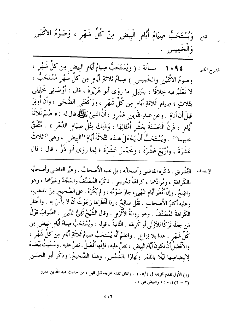 التَّشْريقِ. ذكَرَه القاضى وأصحابُه، بل عليه الأصحابُ. وعبَّر القاضى وأصحابُه بالكَراهَةِ، ومُرادُهما، كراهَةُ تحْريمٍ. ذكَرَه المُصَنِّفُ والمَجْدُ وغيرُهما، وهو واضِحٌ. وإنْ أفْطَر أيَّامَ النَّهْىِ، جازَ صَوْمُه، ولم يُكْرَهْ. على الصَّحيحِ مِنَ المذهبِ، وعليه أكثرُ الأصحابِ. نقَل صالِحٌ، إذا أفْطَرَها رَجَوْتُ أنْ لا بأْسَ به. واخْتارَ الكَراهةَ المُصَنِّفُ. وهو رِوايَةُ الأَثْرَمِ. وقال الشَّيْخُ تَقِىُّ الدِّينِ: الصَّوابُ قوْلُ مَن جعَلَه تَرْكًا للأوْلَى أو كَرِهَه. الثَّانيةُ، قوله: ويُسْتَحَبُّ صِيامُ أَيَّامِ البِيضِ مِن كُلِّ شَهْرٍ. هذا بلا نِزاعٍ. واعلمْ أنَّه يُسْتحَبُّ صِيامُ ثَلاثَةِ أيَّامٍ مِن كلِّ شَهْرٍ، والأفْضَلُ أنْ تكونَ أيَّامَ البِيضِ، نصَّ عليه، فإنَّها أفْضَلُ. نصَّ عليه. وسُمِّيَتْ بَيْضاءَ لِابْيِضاضِها ليْلًا بالقَمَرِ ونَهارًا بالشَّمْسِ. وهذا الصَّحيحُ. وذكَر أبو الحَسَنِ
