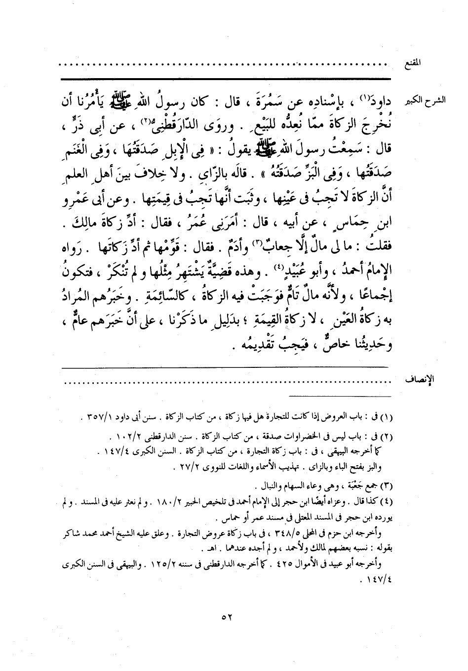 داودَ (¬1)، بإِسْنادِه عن سَمُرَةَ، قال: كان رسولُ اللَّهِ -صلى اللَّه عليه وسلم- يأْمُرُنا أن نُخْرِجَ الزكاةَ ممّا نُعِدُّه للبَيْعِ. وروَى الدّارَقُطْنِىُّ (¬2)، عن أبِى ذَرٍّ، قال: سَمِعْتُ رسولَ اللَّهِ -صلى اللَّه عليه وسلم- يقولُ: «في الإِبِلِ صَدَقَتُهَا، وَفِى الْغَنَم صَدَقَتُها، وَفِي الْبَزِّ صَدَقَتُهُ». قالَه بالزّاى. ولا خِلافَ بينَ أهلِ العلمِ أنَّ الزكاةَ لا تَجِبُ في عَيْنها، وثَبَت أنَّها تَجِبُ في قِيمَتِها. وعن أبى عَمْرِو ابنِ حِمَاسٍ، عن أبيه، قال: أمَرَنِى عُمَرُ، فقال: أدِّ زكاةَ مالِكَ. فقلتُ: ما لى مالٌ إلَّا جِعابٌ (¬3) وأدَمٌ. فقال: قَوِّمْها ثم أدِّ زَكاتَها. رَواه الإِمامُ أحمدُ، وأبو عُبَيْدٍ (¬4). وهذه قَضِيَّةٌ يَشْتَهرُ مِثْلُها ولم تُنْكَرْ، فتكونُ إجْماعًا, ولأنَّه مالٌ تَامٌّ فوَجَبَت فيه الزكاةُ، كالسّائِمَة. وخَبَرُهم المُرادُ به زكاةُ العَيْنِ، لا زكاةُ القِيمَةِ؛ بدَلِيلِ ما ذَكَرْنا، على أنَّ خَبَرَهم عامٌّ، وحَدِيثُنا خاصٌّ، فيَجِبُ تَقْدِيمُه.