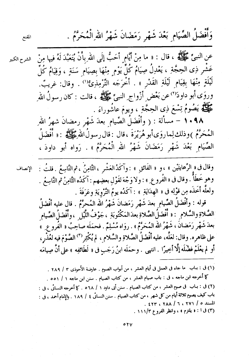 قوله: وأفْضَلُ الصِّيامِ بعدَ شَهْرِ رَمَضانَ شَهْرُ الله المُحرَّمُ. قال عليه أفْضَلُ الصَّلاةِ والسَّلامِ: «أَفْضَلُ الصَّلاةِ بعدَ المَكْتُوبَةِ، جَوْفُ اللَّيْلِ، وأَفْضَلُ الصِّيامِ بعدَ شَهْرِ رَمَضانَ، شَهْرُ الله المُحَرَّمُ». روَاه مُسْلِمٌ. فحمَلَه صاحِبُ «الفُروعِ» على ظاهرِه. وقال: لعَلَّه، عليه أفْضَلُ الصَّلاةِ والسَّلامِ، لم يُكْثِرِ (¬1) الصَّوْمَ فيه لعُذْرٍ، أو لم يعْلَمْ فضْلَه إلَّا أخِيرًا. انتهى. وحمَلَه ابنُ رَجَبٍ في «لَطَائفِه» على أنَّ صِيامَه