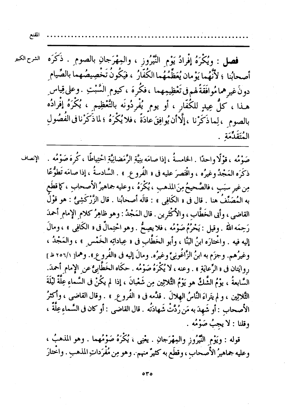 قوله: ويَوْمِ النَّيْرُوزِ والمِهْرَجانِ. يعْنِي، يُكْرَهُ صَوْمُهما. وهو المذهبُ، وعليه جماهيرُ الأصحابِ، وقطَع به كثيرٌ منهم. وهو مِن مُفْرَداتِ المذهبِ. واخْتارَ