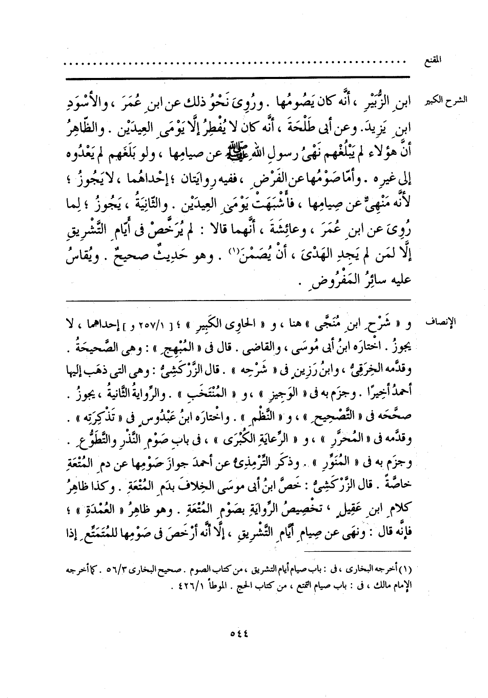 و «شَرْحِ ابنِ مُنَجَّى» هنا، و «الحاوِى الكَبِيرِ»؛ إحداهما، لا يجوزُ. اخْتارَه ابنُ أبي مُوسَى، والقاضى. قال في «المُبْهِجِ»: وهي الصَّحيحَةُ. وقدَّمه الخِرَقِىُّ، وابنُ رَزِينٍ في «شَرْحِه». قال الزَّرْكَشِىُّ: وهي التي ذهَب إليها أحمدُ أخِيرًا. وجزَم به في «الوَجِيزِ»، و «المُنْتَخَبِ». والرِّوايةُ الثَّانيةُ، يجوزُ. صحَّحَه في «التَّصْحِيحِ»، و «النَّظْمِ». واخْتارَه ابنُ عَبْدُوسٍ في «تَذْكِرَتِه». وقدَّمه في «المُحرَّرِ»، و «الرِّعايَةِ الكُبْرَى»، في بابِ صَوْمِ النَّذْرِ والتَّطَوُّعِ. وجزَم به في «المُنَوِّرِ». وذكَر التِّرْمِذِىُّ عن أحمدَ جوازَ صَوْمِها عن دمِ المُتْعَةِ خاصَّةً. قال الزَّرْكَشِىُّ: خَصَّ ابنُ أبي موسَى الخِلافَ بدَمِ المُتْعَةِ. وكذا ظاهِرُ كلامِ ابنِ عَقِيلٍ، تخْصِيصُ الرِّوايَةِ بصَوْمِ المُتْعَةِ. وهو ظاهِرُ «العُمْدَةِ»؛ فإنَّه قال: ونهَى عن صِيامِ أيَّامِ التَّشْرِيقِ، إلَّا أنَّه أرْخَصَ في صَوْمِها للمُتَمَتِّعِ إذا