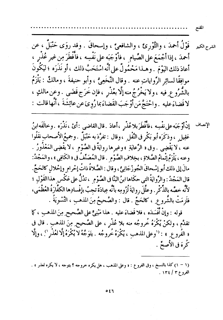 إنْ أوْجَبَه على نفْسِه، فأَفْطَرَ بلا عُذْرٍ، أعادَ. قال القاضى: أيْ، نَذْرَه. وخالَفَه ابنُ عَقِيلٍ، وذكَرَه أبو بَكْرٍ في النَّفْلِ، وقال: تفرَّدَ به حَنْبَلٌ. وجميعُ الأصحابِ نقَلُوا عنه، لا يَقْضِى. وفي «الرِّعايَةِ» وغيرِها رِوايَةٌ في الصَّوْمِ، لا يقْضِى المَعْذُورُ. وعنه، يَلْزَمُ إتْمامُ الصَّلاةِ، بخِلافِ الصَّوْمِ. قال المُصَنِّفُ في «الكَافِى»، والمَجْدُ: مالَ إلى ذلك أبو إسْحاقَ الجُوزْجَانِىُّ، وقال: الصَّلاةُ ذاتُ إحْرامٍ وإحْلالٍ كالحَجِّ. قال المَجْدُ: والرِّوايَةُ التي حكَاها ابنُ البَنَّا في الصَّوْمِ، تدُلُّ على عَكْسِ هذا القَوْلِ؛ لأنَّه خصَّه بالذِّكْرِ. وعلَّلَ رِوايَةَ لُزُومِه بأنَّه عِبادَةٌ تجِبُ بإفْسادِها الكفَّارَةُ العُظْمَى، فلَزِمَتْ بالشُّروعِ، كالحَجِّ. قال: والصَّحيحُ مِنَ المذهبِ، التَّسْوِيَةُ.