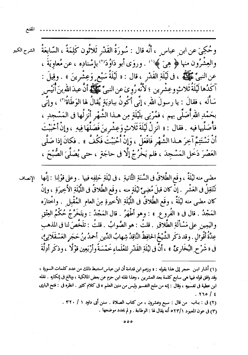 مضَى منه ليْلَةٌ، وقَع الطَّلاقُ في السَّنَةِ الثَّانيةِ، في ليْلَةِ حَلِفِه فيها. وعلى قوْلِنا: إنَّها تَنْتَقِلُ في العَشْرِ. إنْ كان قبلَ مُضِىِّ ليْلَةٍ منه، وقَع الطَّلاقُ في اللَّيْلَةِ الأخِيرَةِ، وإنْ كان مضَى منه ليْلَةٌ، وقَع الطَّلاقُ في اللَّيْلَةِ الأخيرةِ مِنَ العامِ المُقْبِلِ. واخْتارَه المَجْدُ. قال في «الفُروعِ»: وهو أطْهَرُ. قال المَجْدُ: ويتَخَرَّجُ حُكْمُ العِتْقِ واليَمِينِ على مَسْألَةِ الطَّلاقِ. قلتُ: هو الصَّوابُ. قلتُ: تلَخَّصَ لنا في المذهبِ عِدَّةُ أقْوالٍ. وقد ذكَر الشَّيْخُ الحافِظُ النَّاقِدُ شِهابُ الدِّينِ أحمدُ بنُ حَجَرٍ العَسْقَلَانِىُّ، في «شَرْحِ البُخَارِىِّ»، أنَّ في ليْلَةِ القَدْرِ للعُلَماءِ خَمْسَةً وأرْبَعِين قوْلًا، وذكَر أدِلَّةَ