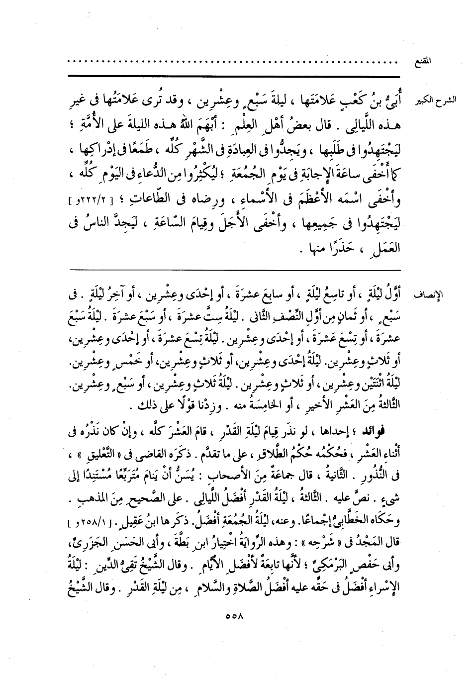 فوائد؛ إحداها، لو نذَر قِيامَ ليْلَةِ القَدْرِ، قامَ العَشْرَ كلَّه، وإنْ كان نَذْرُه في أثْناءِ العَشْرِ، فحُكْمُه حُكْمُ الطَّلاقِ، على ما تقدَّم. ذكَرَه القاضى في «التَّعْليقِ»، في النُّذُورِ. الثَّانيةُ، قال جماعَةٌ مِنَ الأصحابِ: يُسَنُّ أنْ يَنامَ مُتَرَبِّعًا مُسْتَنِدًا إلى شئٍ. نصَّ عليه. الثَّالثةُ، ليْلَةُ القَدْرِ أفْضَلُ اللَّيالِى. على الصَّحيحِ مِنَ المذهبِ. وحَكَاه الخَطَّابِىُّ إجْماعًا. وعنه، ليْلَةُ الجُمُعَةِ أفْضَلُ. ذكَرها ابنُ عَقِيلٍ. قال المَجْدُ فى «شَرْحِه»: وهذه الرِّوايَةُ اخْتِيارُ ابنِ بَطَّةَ، وأبى الحَسَنِ الجَزَرِىِّ، وأبى حَفْصٍ البَرْمَكِىِّ؛ لأنَّها تابِعَةٌ لأفْضَلِ الأيَّامِ. وقال الشَّيْخُ تَقِىُّ الدِّينِ: ليْلَةُ الإِسْراءِ أفْضَلُ فى حَقِّه عليه أفْضَلُ الصَّلاةِ والسَّلامِ، مِن ليْلَةِ القَدْرِ. وقال الشَّيْخُ