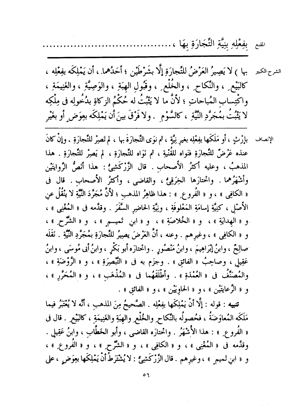 بإِرْثٍ، أو مَلَكَها بفِعْلِه بغيرِ نِيَّةٍ، ثم نوَى التِّجارَةَ بها, لم تَصِرْ للتِّجارَةِ. وإن كانَ عندَه عَرْضٌ للتِّجارَةِ فنَواه للقُنْيةِ، ثم نَوَاه للتِّجارَةِ، لم يَصِرْ للتِّجارَةِ. هذا المذهبُ، وعليه أكثر الأصحابِ. قال الزَّرْكَشِىُّ: هذا أنصُّ الرِّوايتَيْن وأشْهَرُهما. واخْتارَها الخِرَقِىِّ، والقاضى، وأكثرُ الأصحابِ. قال فى «الكافِى»، و «الفُروعِ»: هذا ظاهِرُ المذهبِ؛ لأن مُجَرَّدَ النِّيَّةِ لا ينْقُلُ عنِ الأصْلِ، كنِيَّةِ إسامَةِ المَعْلوفَةِ، ونِيَّةِ الحاضِرِ السَّفَرَ. وقدَّمه فى «المُغْنِى»، و «الهِدايَةِ»، و «الخُلاصَةِ»، و «ابنِ تَميمٍ»، و «الشَّرْحِ»، و «الكافِى» وغيرِهم. وعنه، أنَّ العَرْضَ يصيرُ للتِّجارَةِ بمُجَرَّدِ النِّيَّةِ. نَقَلَه صالِحٌ، وابنُ إبْرَاهِيمَ، وابنُ مَنْصُور. واخْتارَه أبو بَكْرٍ، وابنُ أبى مُوسَى، وابنُ عَقِيل، وصاحِبُ «الفائقِ». وجزَم به فى «التَّبْصِرَةِ»، و «الرَّوْضَةِ»، والمُصَنِّف فى «العُمْدَةِ». وأطْلَقَهُما فى «المُذْهَبِ»، و «المُحَرَّرِ»، و «الرِّعايتَيْن»، و «الحاوِيَيْن»، و «الفائقِ».