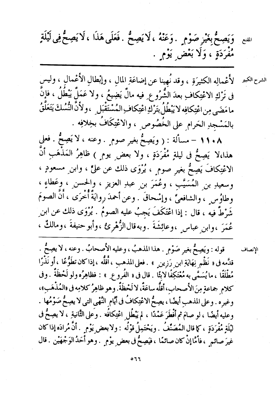 قوله: ويَصِحُّ بغيرِ صَوْمٍ. هذا المذهبُ، وعليه الأصحابُ. وعنه، لا يصِحُّ. قدَّمه في «نَظْمِ نِهَايَةِ ابنِ رَزِينٍ». فعلى المذهبِ، أَقلُّه، إذا كان تطَوُّعًا، أو نَذْرًا مُطْلَقًا، ما يُسَمَّى به مُعْتَكِفًا لابِثًا. قال في «الفُروعِ»: فظاهِرُه ولو لَحْظَةٌ. وفي كلامِ جماعةٍ مِنَ الأصحابِ، أقلُّه ساعَةٌ، لا لَحْظَةٌ. وهو ظاهِرُ كلامِه في «المُذْهَبِ»، وغيرِه. وعلى المذهبِ أيضًا، يصِحُّ الاعْتِكافُ في أيَّامِ النَّهْىِ التي لا يصِحُّ صَوْمُها. وعليه أيضًا، لو صامَ ثمَّ أفْطَرَ عَمْدًا، لم يَبْطُلِ اعْتِكافُه. وعلى الثَّانيةِ، لا يصِحُّ في ليْلَةٍ مُفْرَدَةٍ، كما قال المُصَنِّفُ. ويَحْتَمِلُ قوْلُه: ولا بعضِ يَوْمٍ. أنَّ مُرادَه إذا كان غيرَ صائمٍ، فأمَّا إنْ كان صائمًا، فيَصِحُّ في بعضِ يوْمٍ. وهو أحَدُ الوَجْهَيْن. قال