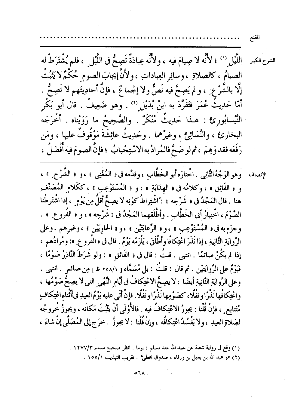 وهو الوَجْهُ الثَّانِي. اخْتارَه أبو الخَطَّابِ، وقدَّمه في «المُغْنِي»، و «الشَّرْحِ»، و «الفَائِق»، وكلامُه في «الهِدَايَةِ»، و «المُسْتَوْعِبِ»، ككَلامِ المُصَنِّفِ هنا. قال المَجْدُ في «شَرْحِه»: اشْتِراطُ كوْنِه لا يصِحُّ أقلُّ مِن يَوْمٍ، إذا اشْتَرطْنا الصَّوْمَ، اخْتِيارُ أبي الخَطَّابِ. وأطْلَقهما المَجْدُ في «شَرْحِه»، و «الفُروعِ». وجزَم به فى «المُسْتَوْعِبِ»، و «الرِّعايَتَيْن»، و «الحاوِيَيْن»، وغيرِهم. وعلى الرِّوايَةِ الثَّانِيةِ، إذا نَذَرَ اعْتِكافًا وأطْلَقَ، يَلْزَمُه يَوْمٌ. قال في «الفُروعِ»: ومُرادُهم، إذا لم يكُنْ صائمًا. انتهى. قلتُ: قال في «الفَائقِ»: ولو شَرَطَ النَّاذِرُ صَوْمًا، فيَوْمٌ على الرِّوايَتيْن. ثمَّ قال: قلتُ: بل مُسَمَّاه مِن صائمٍ. انتهى. وعلى الرِّوايَةِ الثَّانِيةِ أيضًا، لا يصِحُّ الاعْتِكافُ في أيَّامِ النَّهْىِ التي لا يصِحُّ صَوْمُها، واعْتِكافُها نَذْرًا ونفْلًا، كصَوْمِها نَذْرًا ونَفْلًا. فإنْ أتَى عليه يَوْمُ العيدِ في أثْناءِ اعْتِكافٍ مُتَتابعٍ، فإنْ قُلْنا: يجوزُ الاعْتِكافُ فيه. فالأَوْلَى أنْ يثْبُتَ مَكانَه، ويجوزُ خُروجُه لصَلاةِ العيدِ، ولا يَفْسُدُ اعْتِكافُه، وإنْ قُلْنا: لا يجوزُ. خرَج إلى المُصَلَّى إنْ شاءَ،
