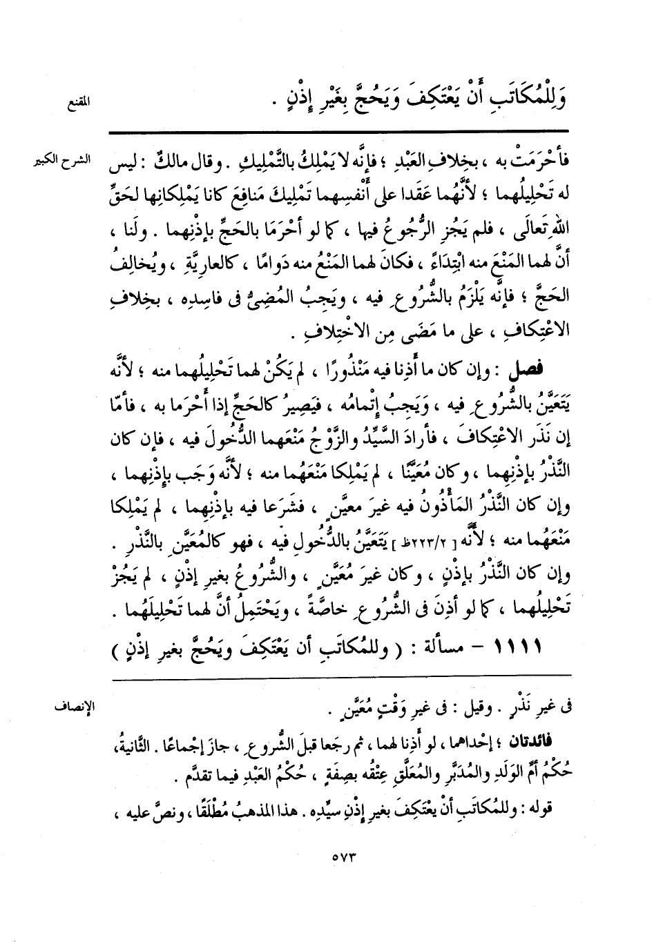 وَلِلْمُكَاتَبِ أَنْ يَعْتَكِفَ وَيَحُجَّ بِغَيْرِ إِذْنٍ.
